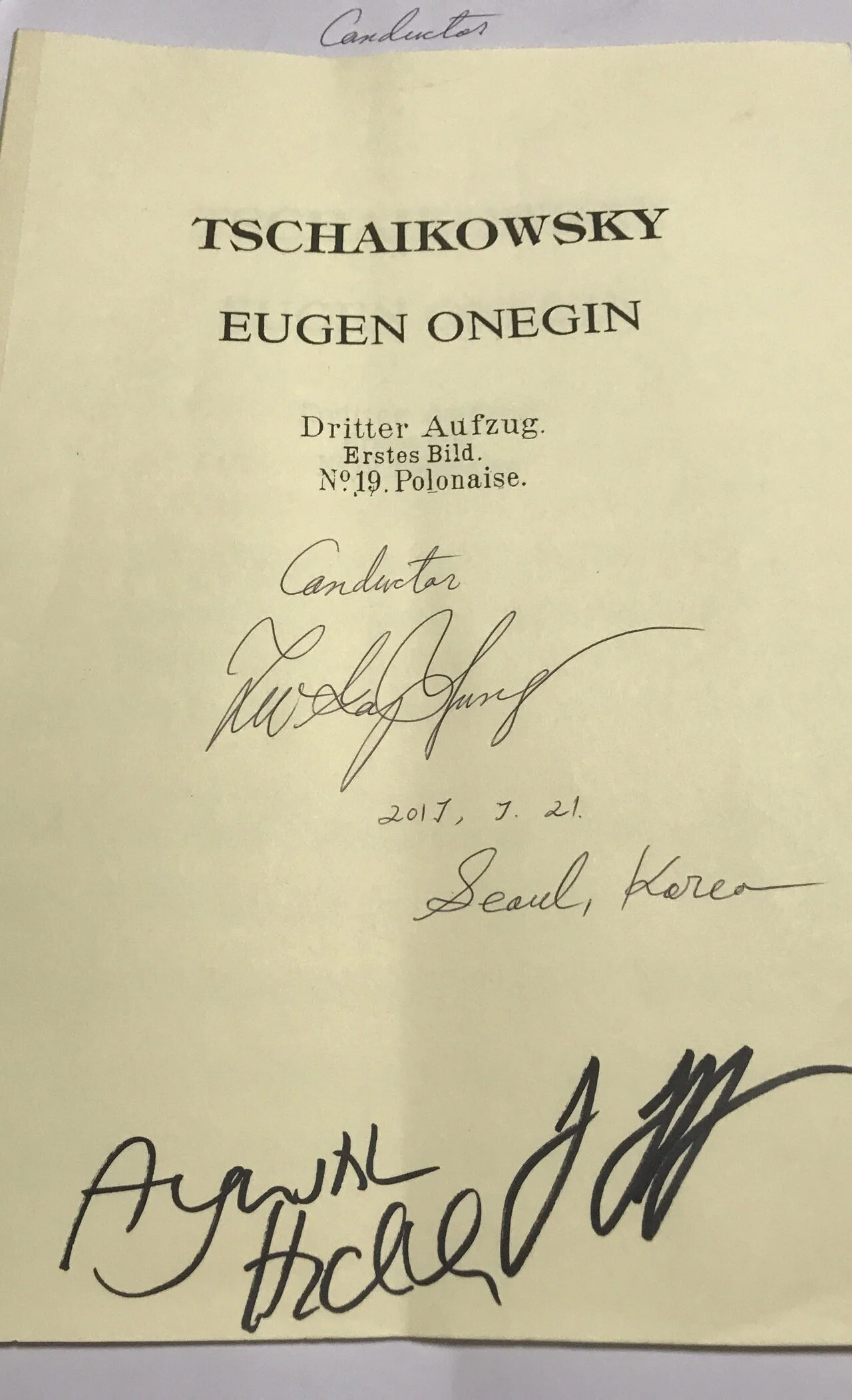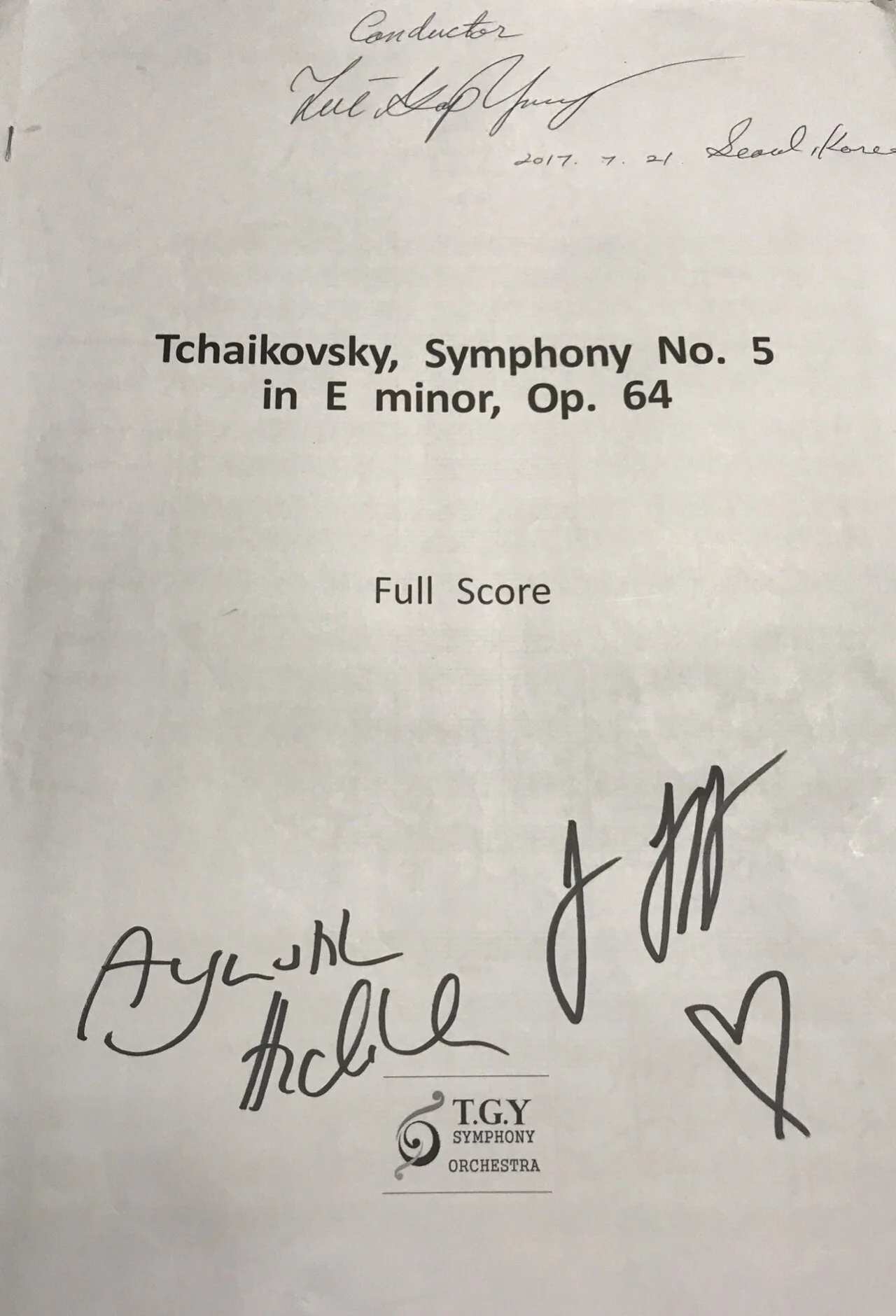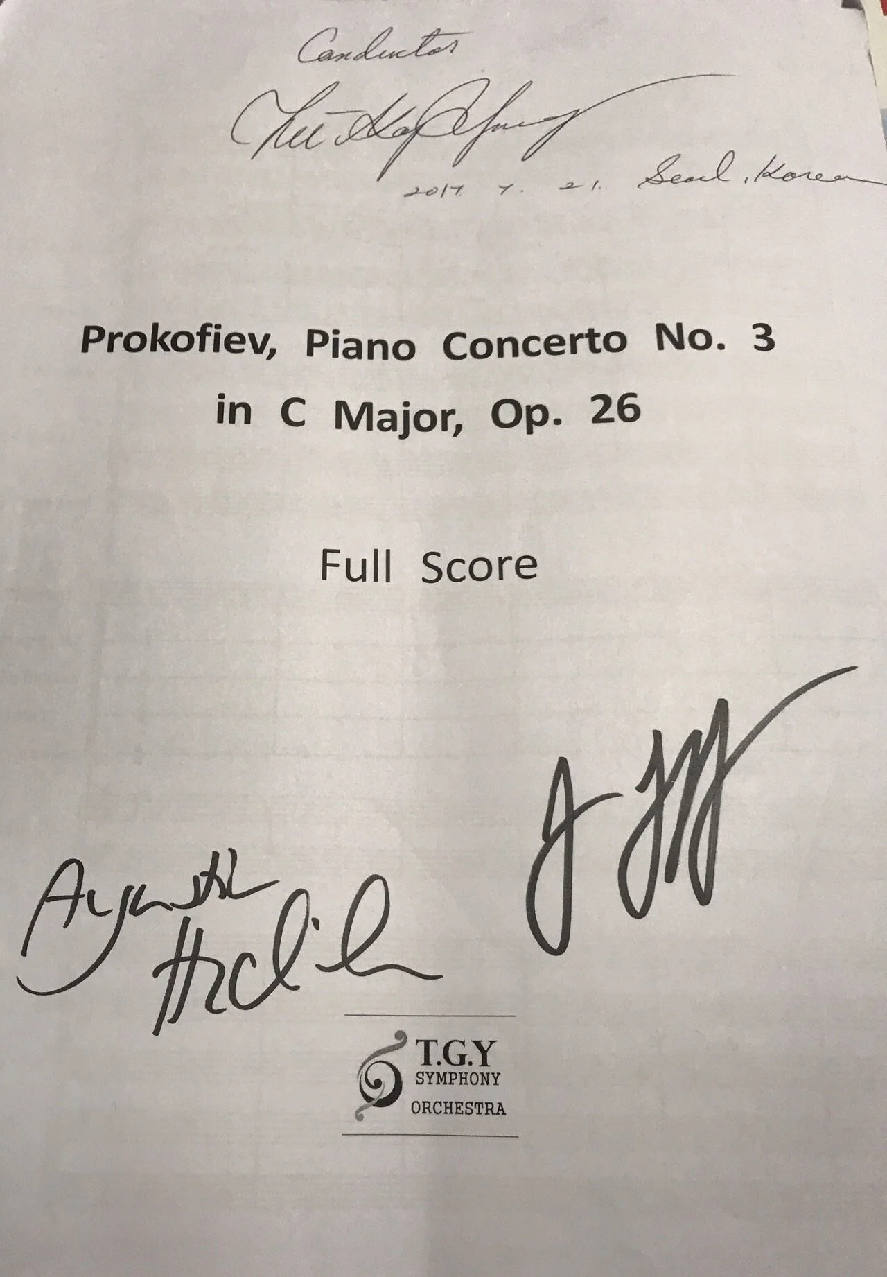 그때 내 지휘로 TGY심포니와 연주가 잡혀있었는데 차이코프스키 심포니 5번, 프로코피예프 피아노 협주곡3번, 차이코프스키의 오페라 유진오니에긴 중 폴로네이즈 스코어에 싸인도 해줬던 세계적인 내 친구 아티스트들!