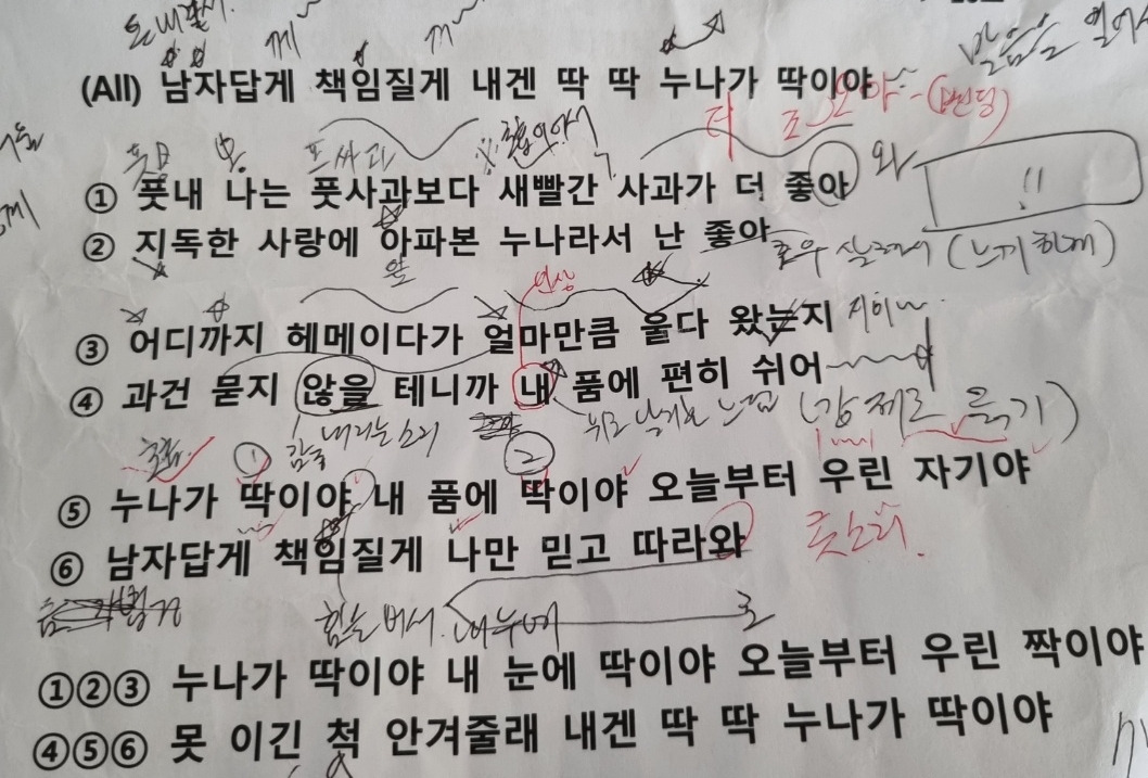 이런 식으로 안무는 똑같이 이루어지는 도중에 번호에 따라 부르는 부분이 달라지는 것이었다. 그리고 당일에 내가 어떤 번호를 부여받을지 모르기에 특정 파트만 연습할 수도 없다. 불러야 될 부분에 안 부르든지, 파트 신경 쓰다 안무를 까먹는다든지, 안 부를 때 마이크 위치가 이상하다든지, 실수의 모든 경우의 수가 연습 때마다 발생했다.