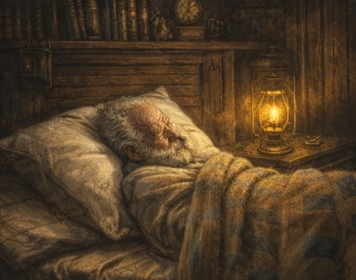몸은 지쳐 있다. 그는 침대에 누워 깊이 잠든다.