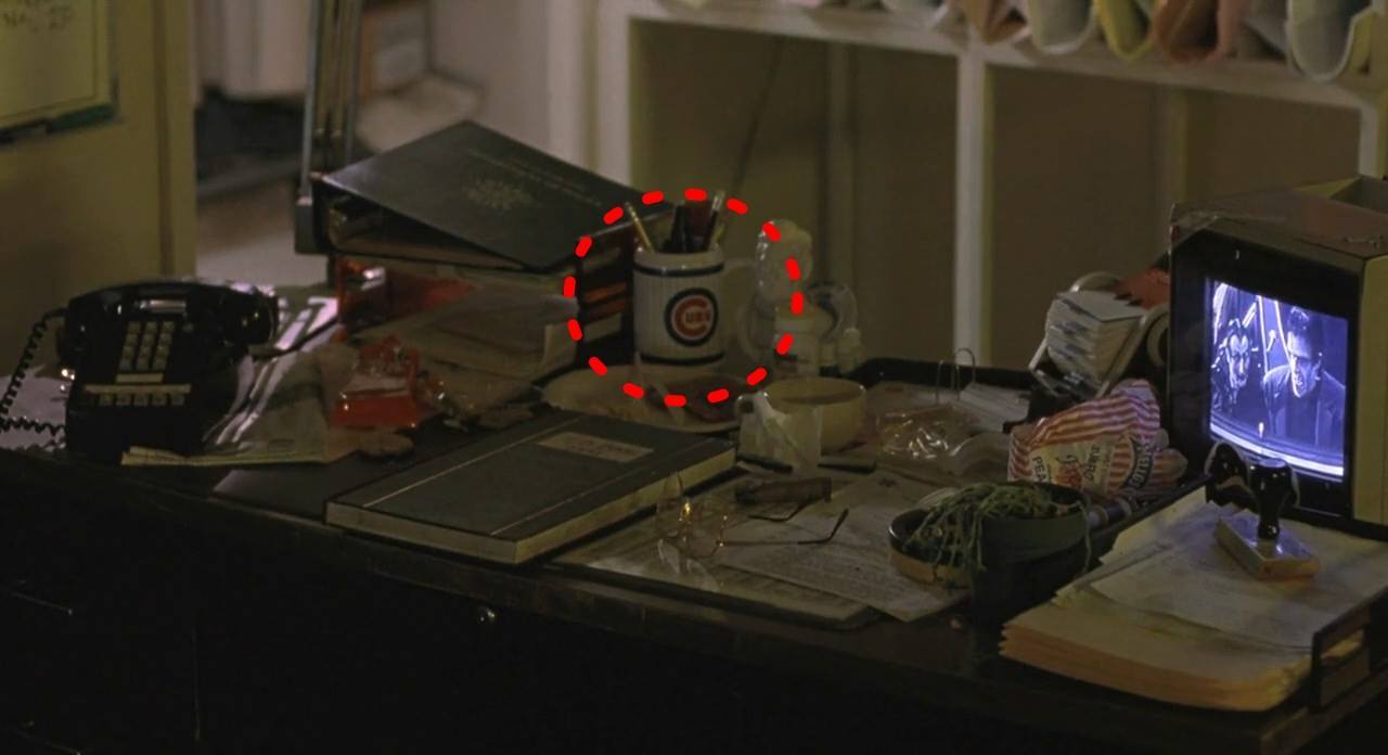 어쨌든 이 영화에서 야구와 관련한 것은 쉽게 찾기 어렵다. 머레이가 화이트삭스를 슬쩍 언급하는 장면은 있지만. 그렇지만 눈을 크게 뜨고 보면, 보인다. 영화 시작부터. 살인 사건을 알리는 전화가 울리기 전, 경찰서 책상 위에 잡다한 물건 가운데 연필꽂이로 쓰는 머그잔이 보인다. 그 잔에 시카고 컵스의 로고가 딱! 사실 흐릿하지만 술집에서도 컵스의 로고를 볼 수 있다.