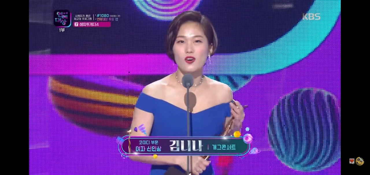 유재석씨의 호명으로 그녀는 수줍게 미소를 띄며 자리에서 조신하게 일어섰다. 평소에 개콘에서 보던 이미지와는 많이 다르게 다소곳이 걷는다. 파란색 드레스를 입은 그녀는 얼핏 봐선 영화배우 같다. 하지만 시상식 무대에서 꽃다발을 건네는 수많은 남자개그맨들의 꽃다발을 내팽개치는 그녀는 천생 개그맨이다.