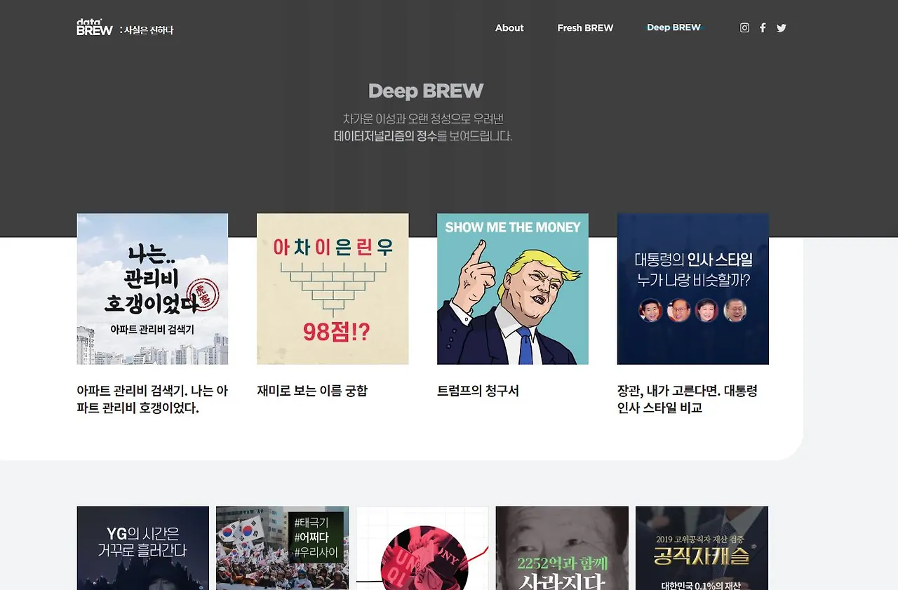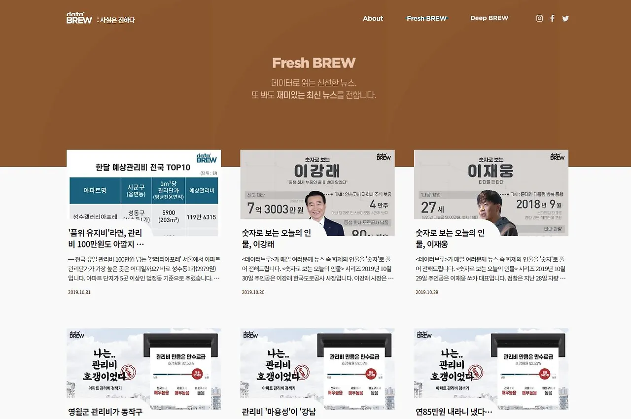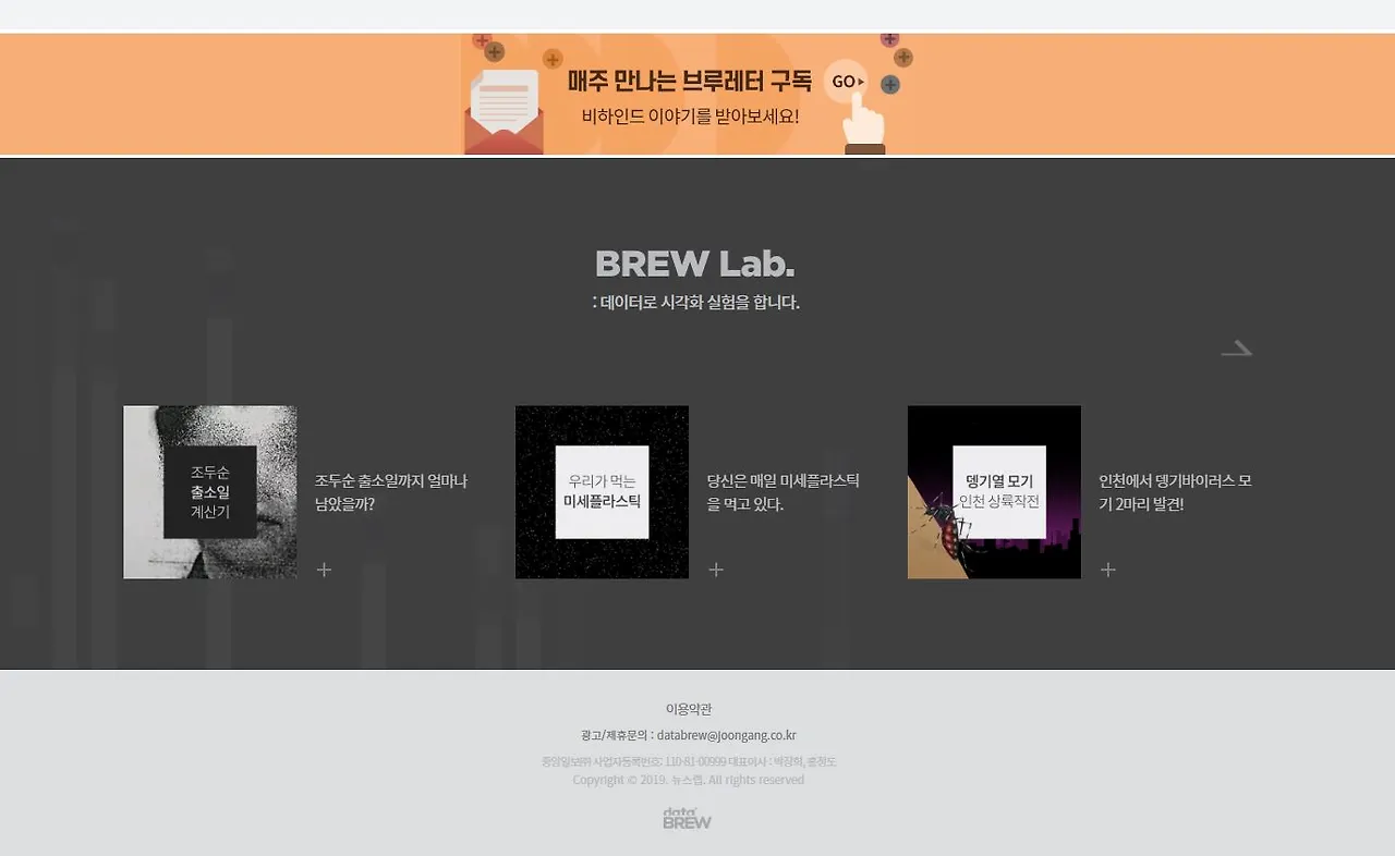 'dataBrew'라는 이름부터 BI, 사이트 제작까지 참 다들 고생했다. 말도 안 되는 일정이라 기획자부터 디자이너, 개발자들이 고생 좀 하심. 간단해 보이는 반응형 페이지지만 기사도 끌어와야 하고, 새로운 CMS 개발에 트래킹 코드도 다시 심어야 하는 등 신경 쓸게 꽤 많았다.