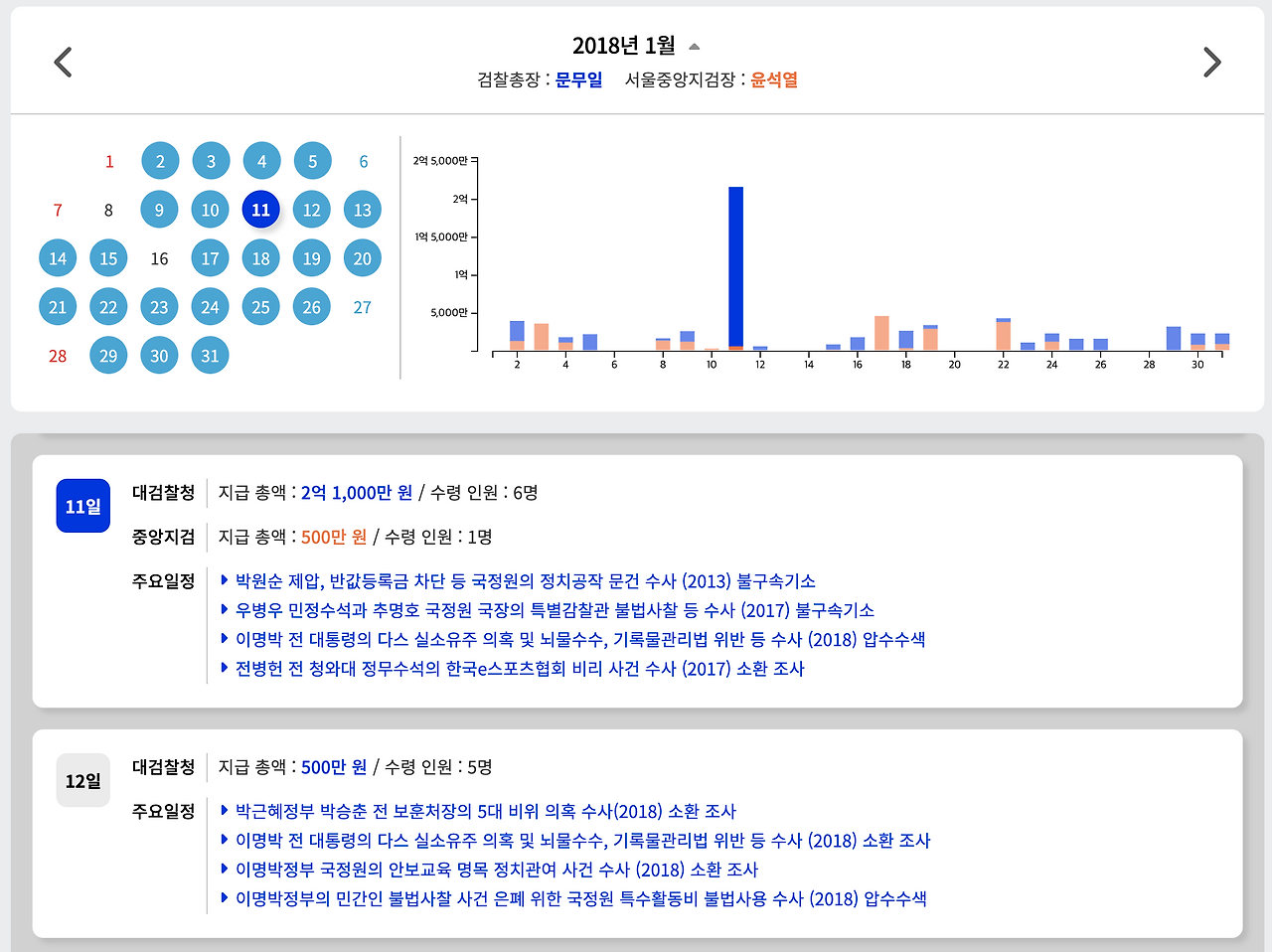 예를 들어 '검찰의 금고를 열다' 페이지에서 2018년 2월 22일 일정을 보면 범죄수익환수부 현판식이 있었고 중앙지검의 특활비 지급은 7명에게 3천만 원 지급으로 나와있다.