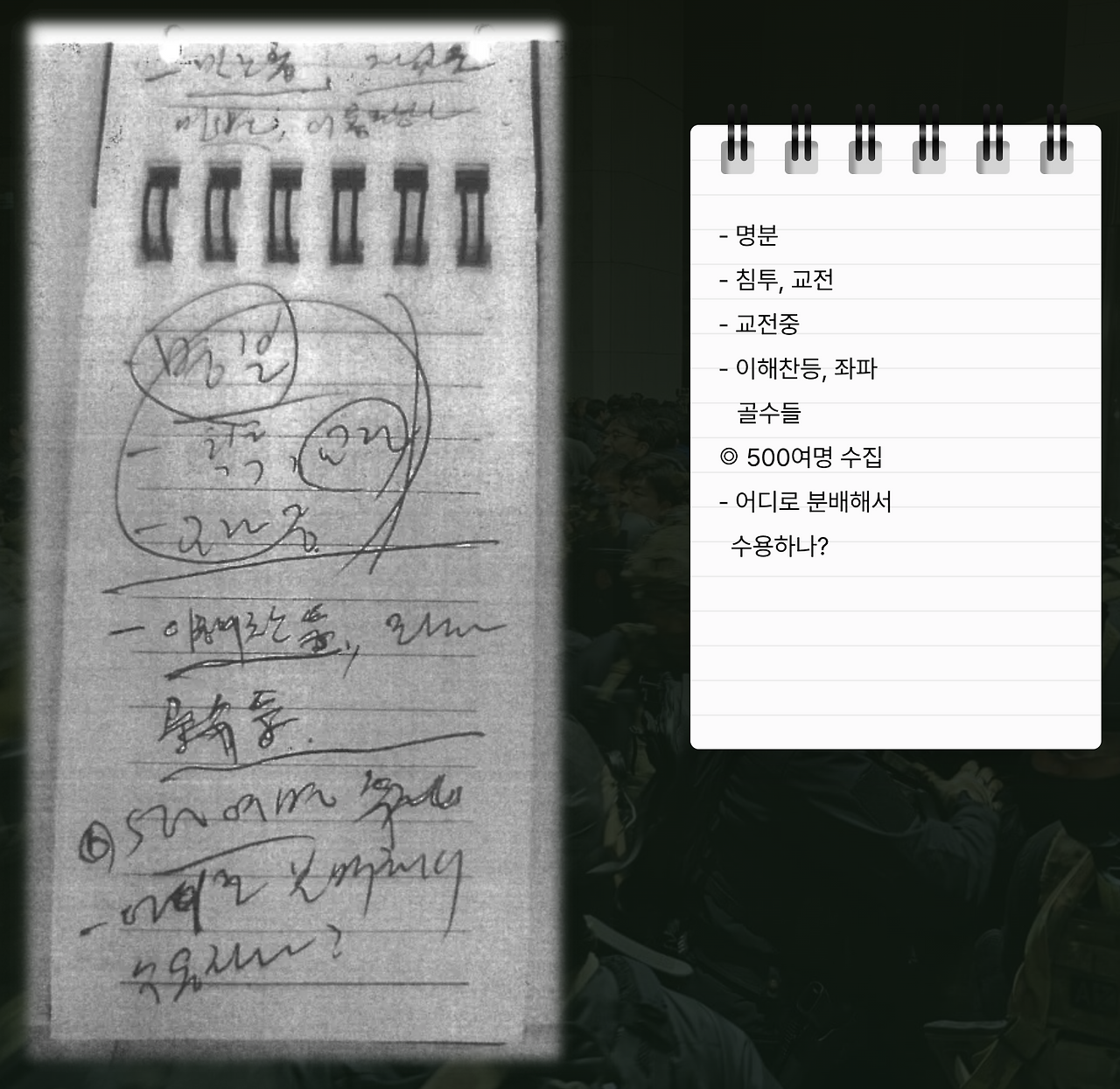 이름만 들어도 롯*데리아가 떠오르는 사람! 노상원 전 정보사령관이 작성한 총 70쪽 분량의 자필 노트에는 계엄을 '행사'로 체포를 '수거'로 표현하며 약 500여 명의 정치인, 언론인, 유튜버를 처분하겠다는 무시무시한 계획이 상세히 담겨있었다. 여의도 체포 확대 -> 전국 봉쇄 -> 수용소 설치 등 실행 단계별 계획도 포함되어 있다. 이 험한 것을 어떻게 잘 보여줄 수 있을까?
