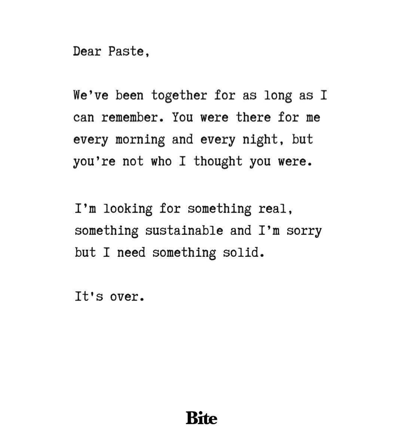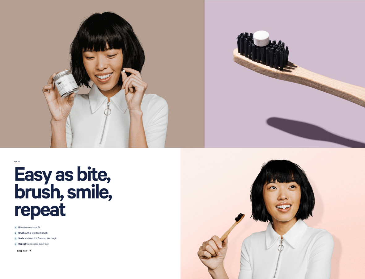 기존 치약의 튜브 패키지가 환경문제의 원인이 된다는 것을 깨닫고 변화가 필요하다는 메시지를 전달하고 있는 글쓴이는 씹는 방식의 신개념 치약 브랜드 Bite입니다.