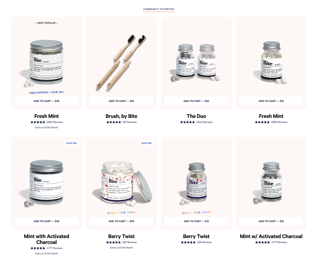 유리병에 담긴 Bite 치약은 개별 약 30달러로 62개의 타블릿이 들어있습니다. 종류는 미백 효과가 있는 Charcoal부터 Mint, Lavender, Berry 등 기호에 따라 선택이 가능하며 칫솔과 함께 구매하거나 세트로도 구입할 수 있습니다. 구독 서비스를 신청하면 4달에 한번 선택된 제품이 집으로 배송됩니다.