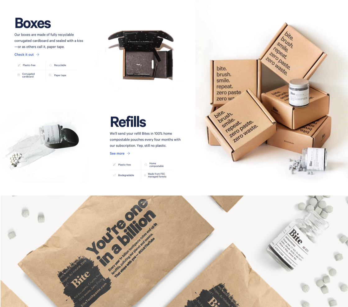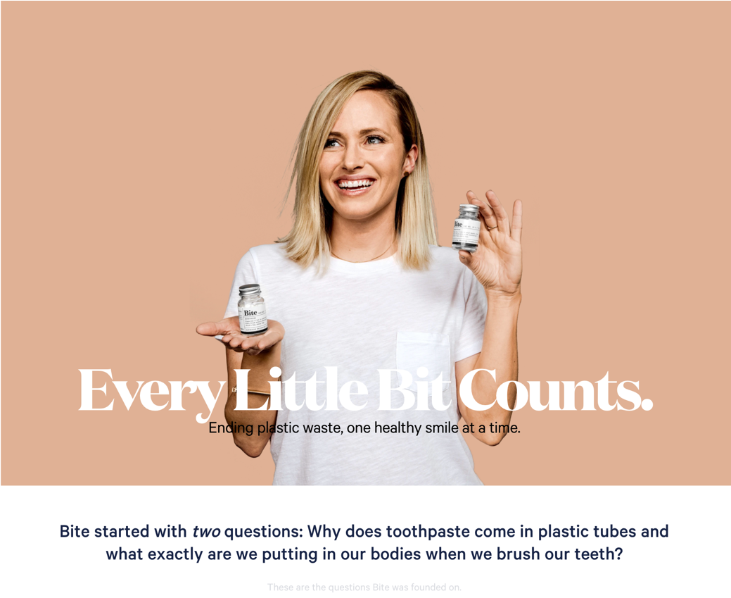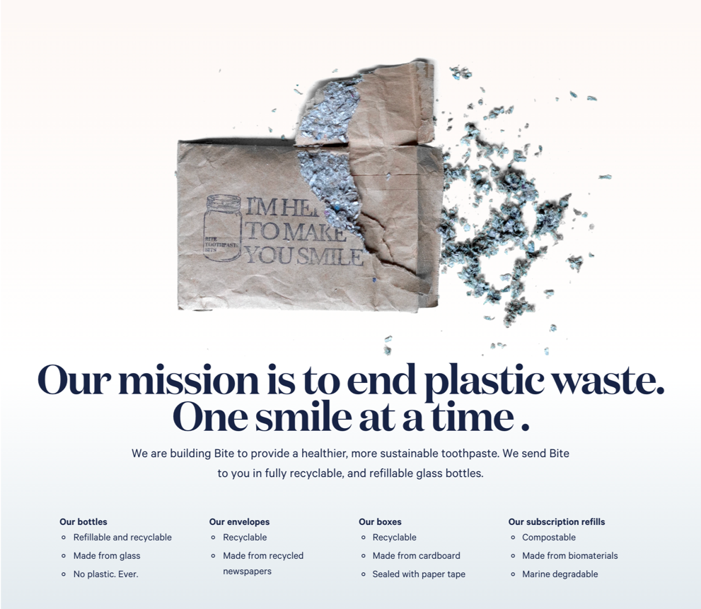 매년 10억 개의 플라스틱 튜브들이 버려지고 있고, 이러한 문제의 해결을 위해 Bite는 그들의 미션을 플라스틱 쓰레기를 끝내는 것으로 선포하고, 모든 과정에 있어 Zero-waste 패키지 솔루션을 제시합니다.