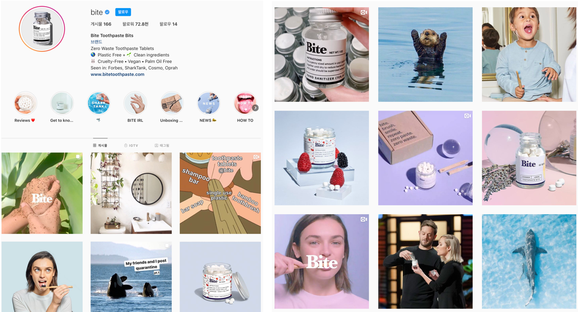 Bite의 인스타그램 피드는 그들의 철학과 미션이 잘 드러나도록, 동물 실험을 반대하거나 플라스틱 사용을 줄이도록 권장하는 콘텐츠가 유쾌하면서도 세련된 스타일로 업로드됩니다. 동물과 자연을 사랑하는 브랜드임을 일관되게 강조함으로써 밀레니얼 고객과의 공감대를 형성하려는 노력인 것이죠.