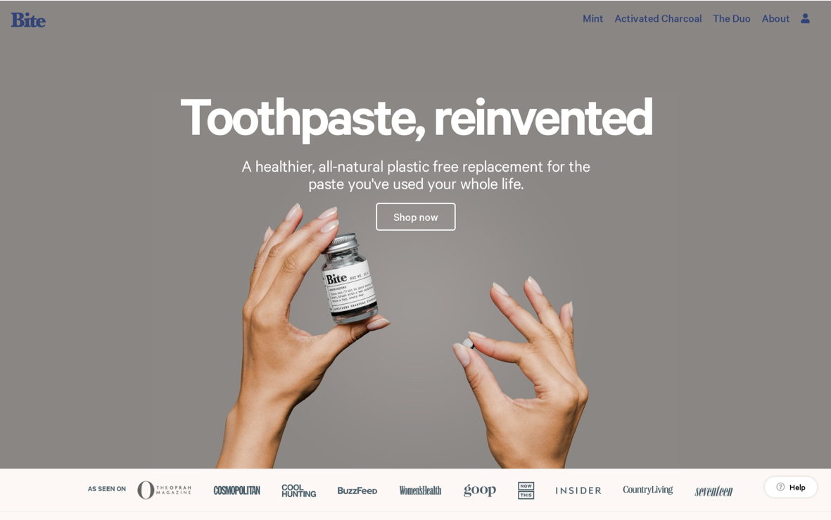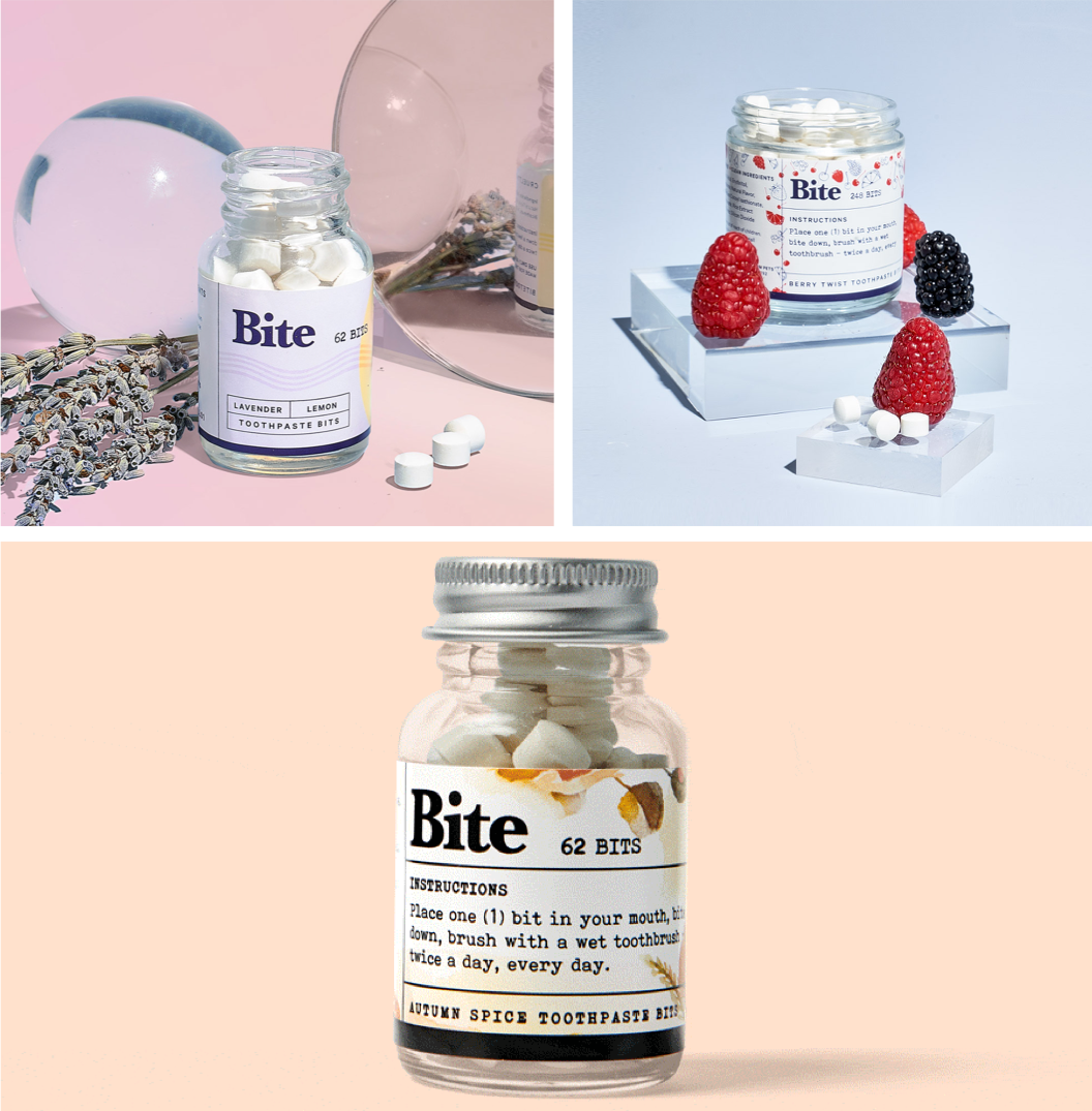 치약의 라벨에서 주성분을 살펴보면 몸에 유해한 화학물질과 색소들이 포함되어 있는 경우가 많습니다. Bite는 이러한 물질들을 배제하고 좋은 것만 남겨 압축하고 또 압축해, 박테리아가 서식하기 좋은 습기 찬 환경을 피할 수 있는 드라이 타블릿 형태로 만들었습니다.
