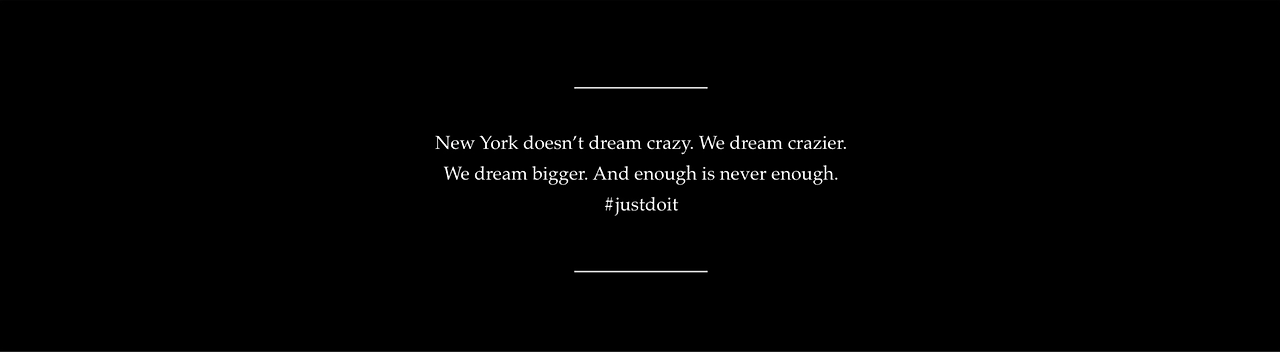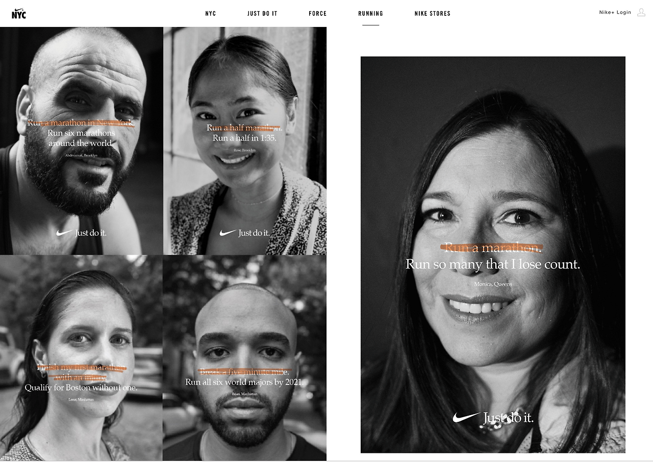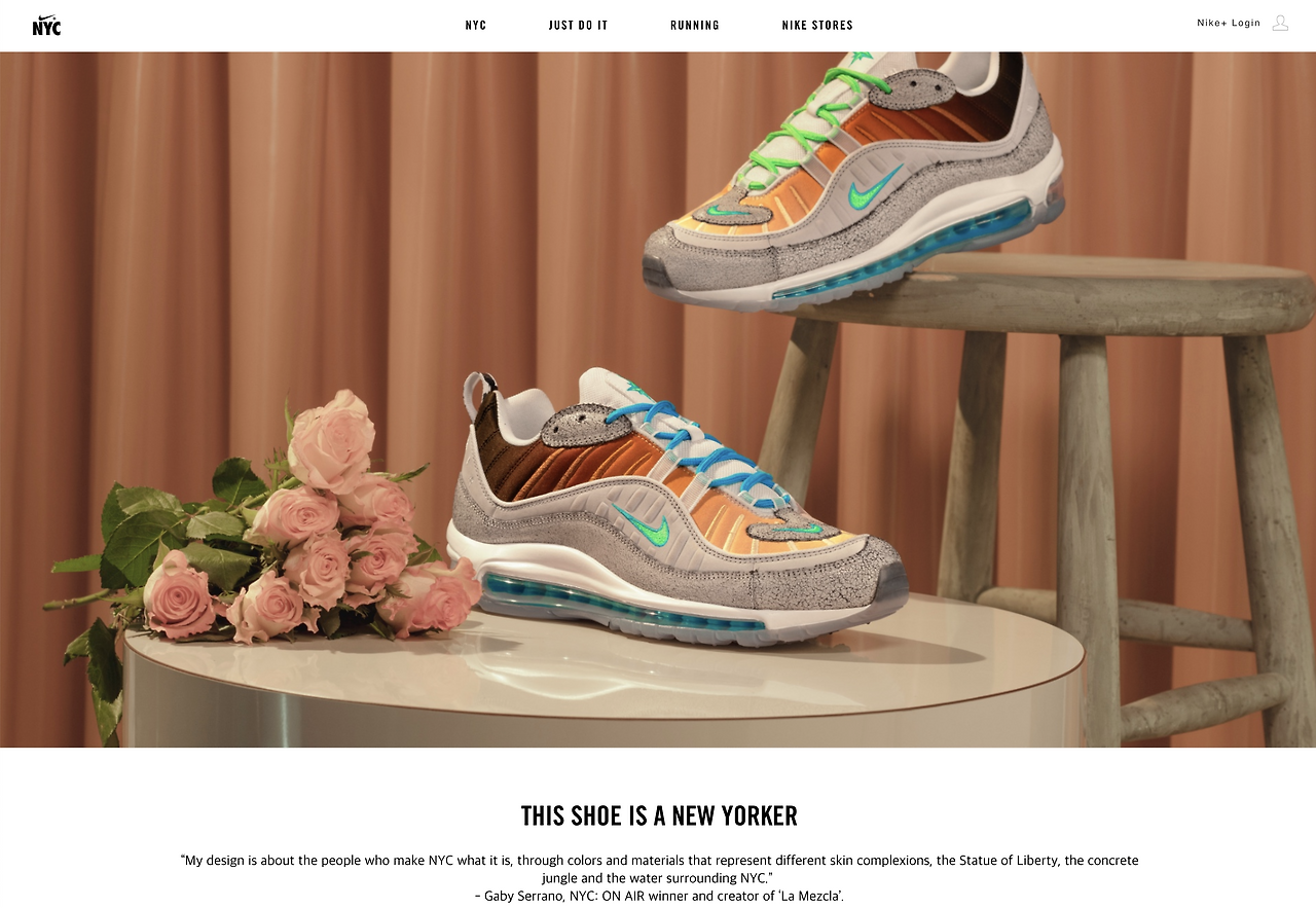 뉴요커들을 위해 디자인된 신발을 “a New Yorker”라고 소개합니다. 뉴욕 특유의 자유분방함과 다양한 인종들의 피부색에서 영감을 받은 신발은 그들의 라이프스타일을 대표하는 상징성을 지니게 됩니다. 또한 콘텐츠를 통해 다양한 뉴요커들의 모습과 스토리를 공유합니다. 그들의 슬로건인 “Just Do it”과 함께 열심히 살아가는 뉴요커들의 이야기를 담아 하나의 공동체 의식을 유도합니다.