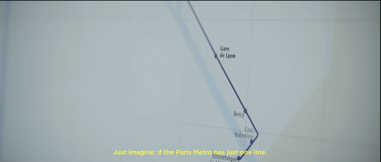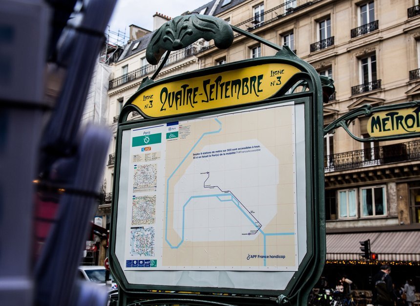 파리의 지하철 맵을 장애인들이 유일하게 이용 가능한 14호선 라인만을 남겨두고 다시 디자인하여, 모든 역의 기존 맵 위에 덮어 붙였습니다. 만약 파리의 지하철 노선이 단 한 개밖에 존재하지 않는다면 얼마나 불편할지를 강조한 것입니다.