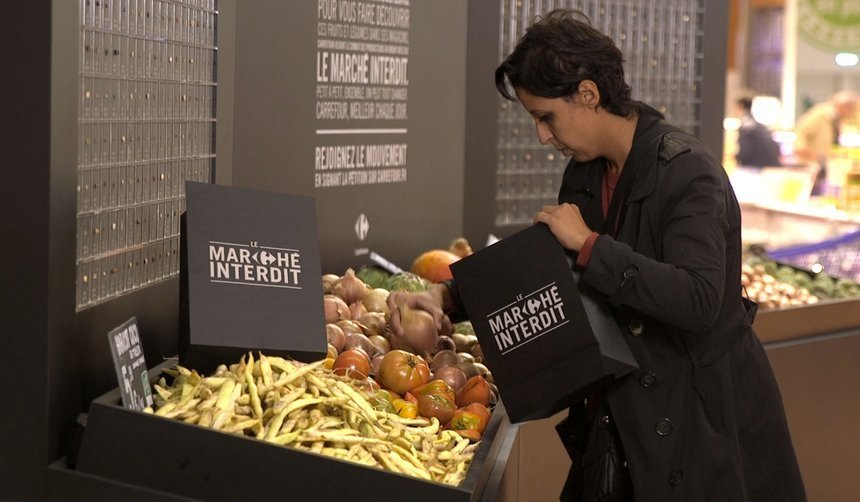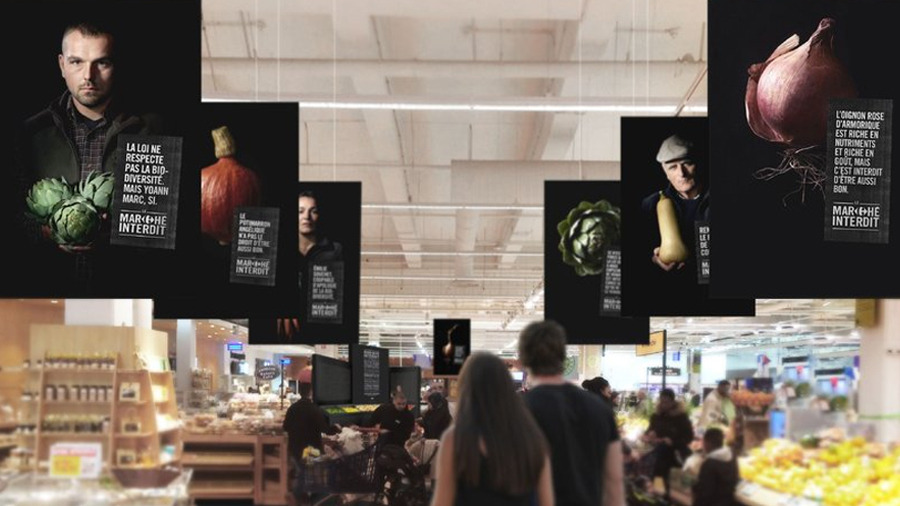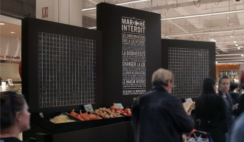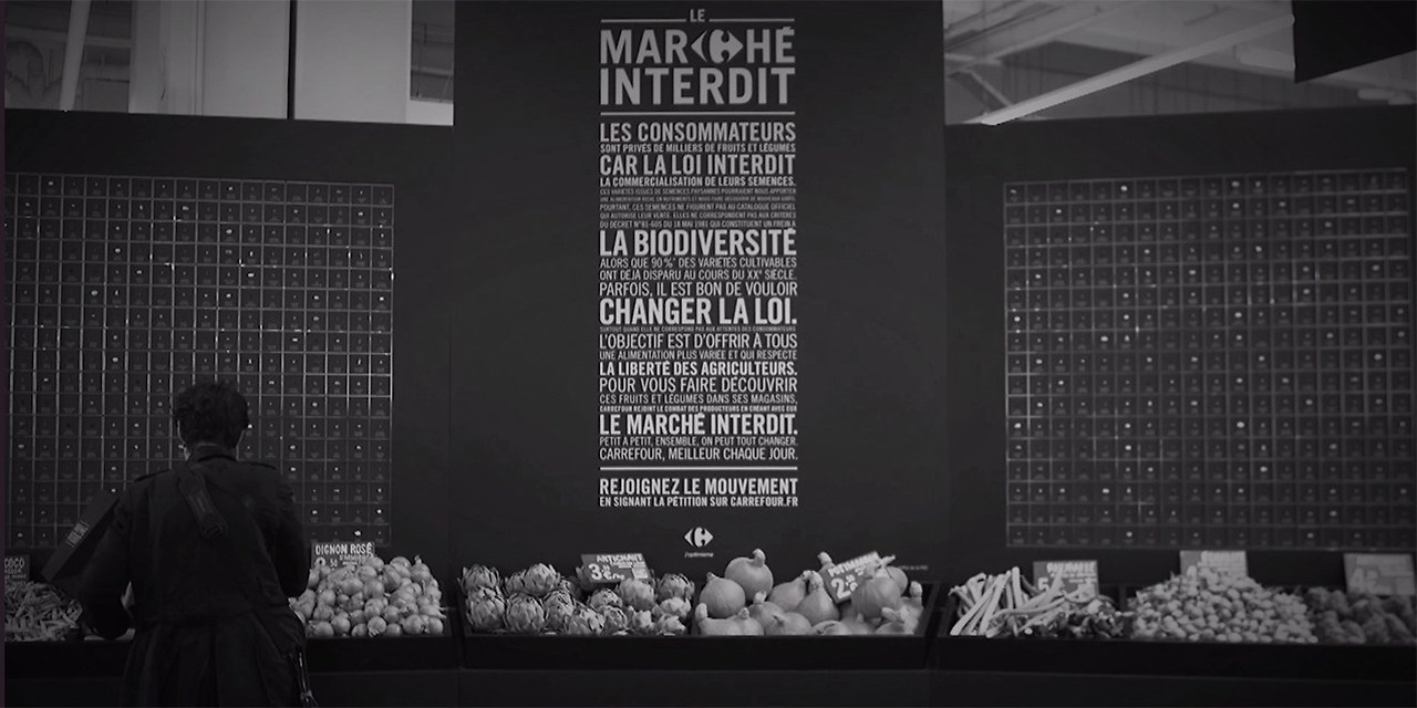 까르푸는 엄청난 금액의 벌금을 각오하고 불법으로 규정된 97%의 유기농 생산업체들과 5년간의 후원 계약을 체결하여 다양한 품종의 질 좋은 과일과 채소를 매장에서 판매하도록 했습니다. 매장 입구에는 금지되었던 품종 하나하나를 디스플레이하여 얼마나 많고 다양한 유기농 농산물이 존재하는지 알리고 그동안 이 많은 것들이 법적으로 금지되었음을 임팩트 있게 보여줍니다.