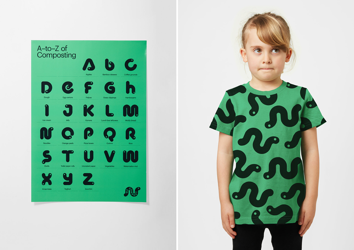 의뢰를 받은 뉴질랜드의 디자인 스튜디오 Seachange는 신선하고도 새로운 비주얼 전략을 내세웠습니다. 재미있고, 모던하고, 모든 연령대에 어필할 수 있도록 퇴비에서 중요한 역할을 하는 지렁이를 메인 그래픽 아이덴티티로 디자인한 것입니다.