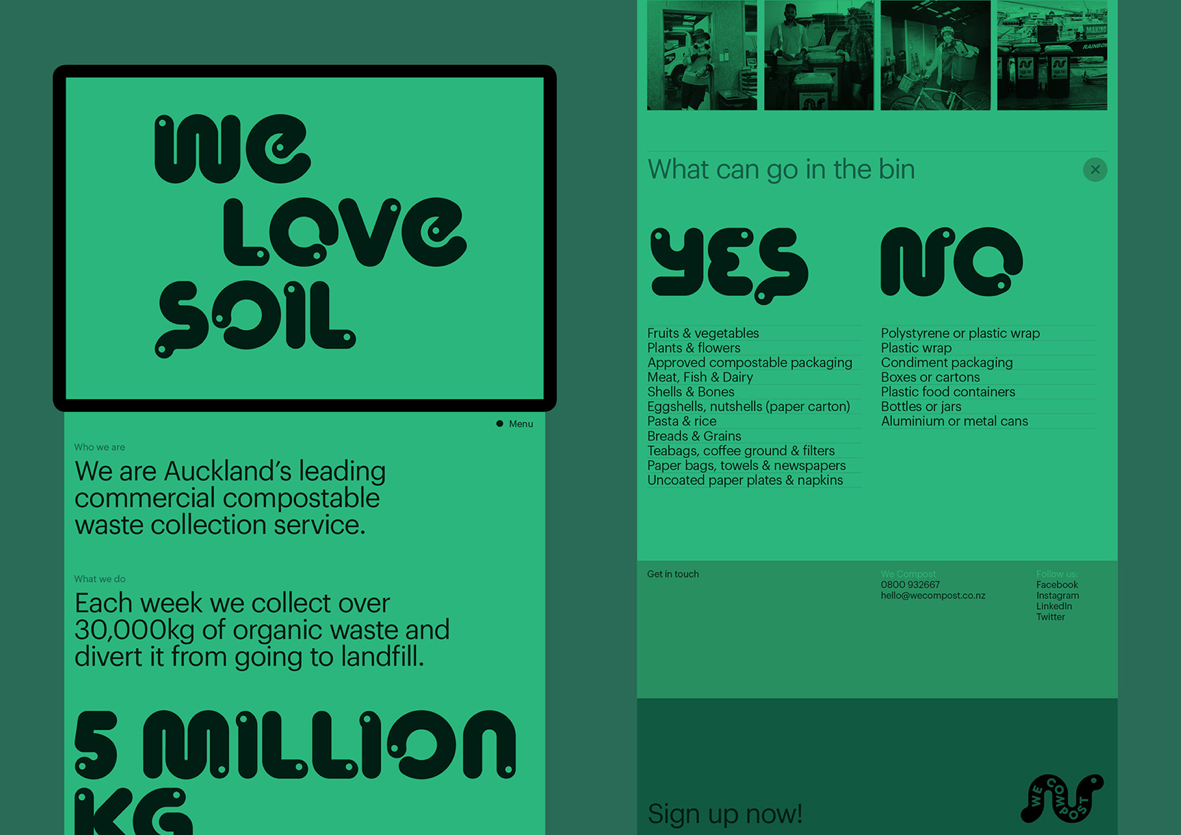 7년간의 운영 끝에 오클랜드 메인 서비스로 성장한 We compost는 그들이 하는 일을 환경을 생각하는 사람들 뿐 아니라 더 다양한 연령층의 사람들에게 쉽게 커뮤니케이션하기 위해 기억에 남는 새로운 아이덴티티가 필요했습니다.