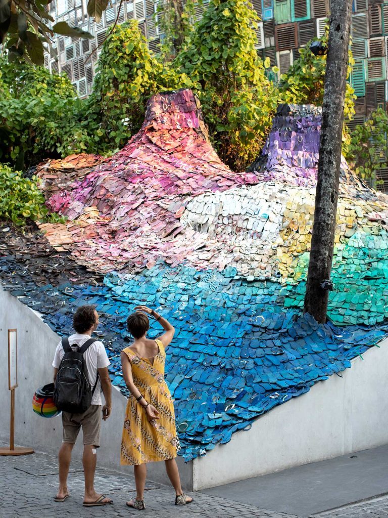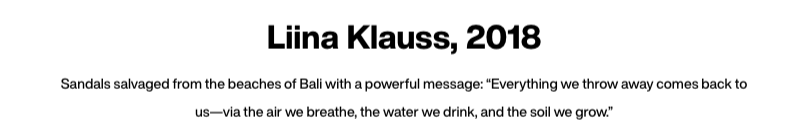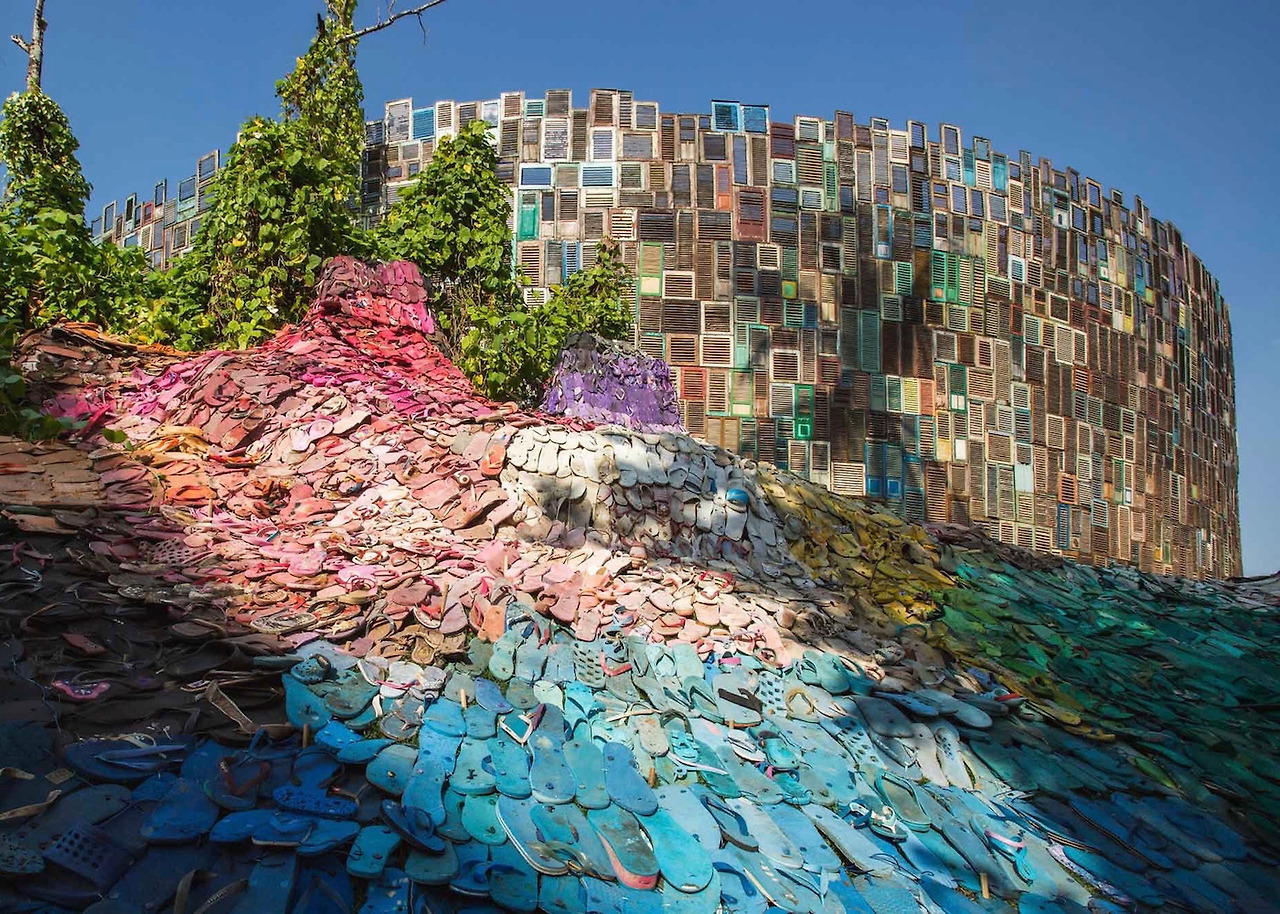 2018년 Future Design Week에서 아티스트 Liina Klauss는 발리의 해변가에 버려진 5000개의 샌들로 설치미술을 제작하여, “우리가 버리는 모든 것은 다시 우리에게 돌아온다”라는 메시지를 전하기도 했는데요, 어마어마한 양의 샌들이 모여 마치 지구를 삼킬듯한 임팩트와 함께 색색가지의 조합으로 놀라움을 자아냅니다.