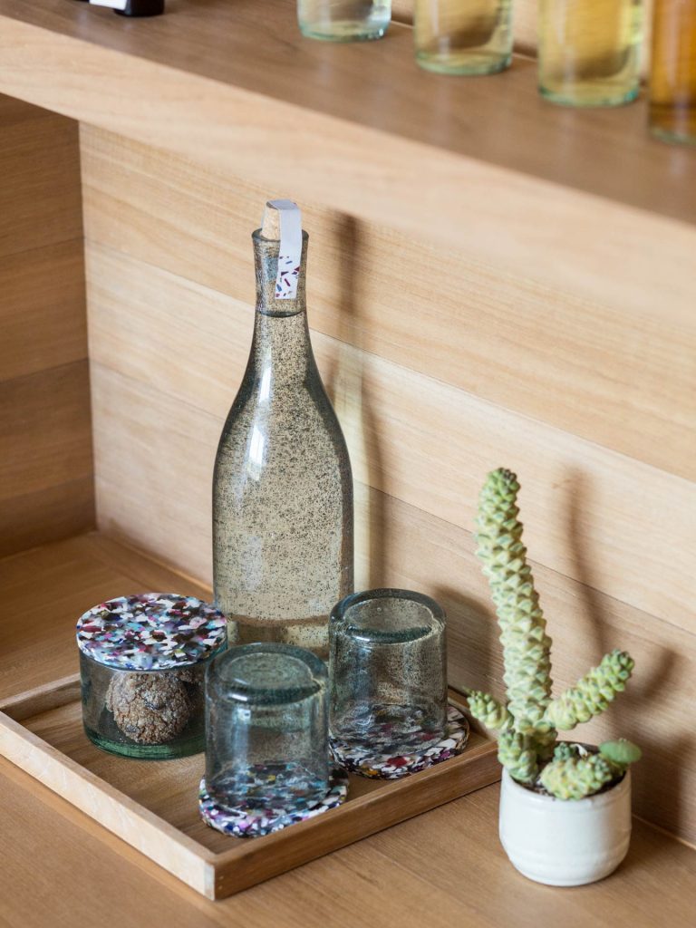 방 안에 제공되는 어매니티 키트는 재활용된 물병과 파우치, 대나무 빨대, 바이오 슬리퍼 등을 제공하고, 화장품은 리필 가능한 형태, 바구니나 썬 캡은 먹다 버린 굴 껍데기와 조개를 활용한 신소재로 만들어진 것을 사용합니다. 모든 가구와 소재들 또한 재활용 소재로 업사이클링되거나, 지역 문화의 장인정신을 담은 공예품으로 이루어져 있습니다.