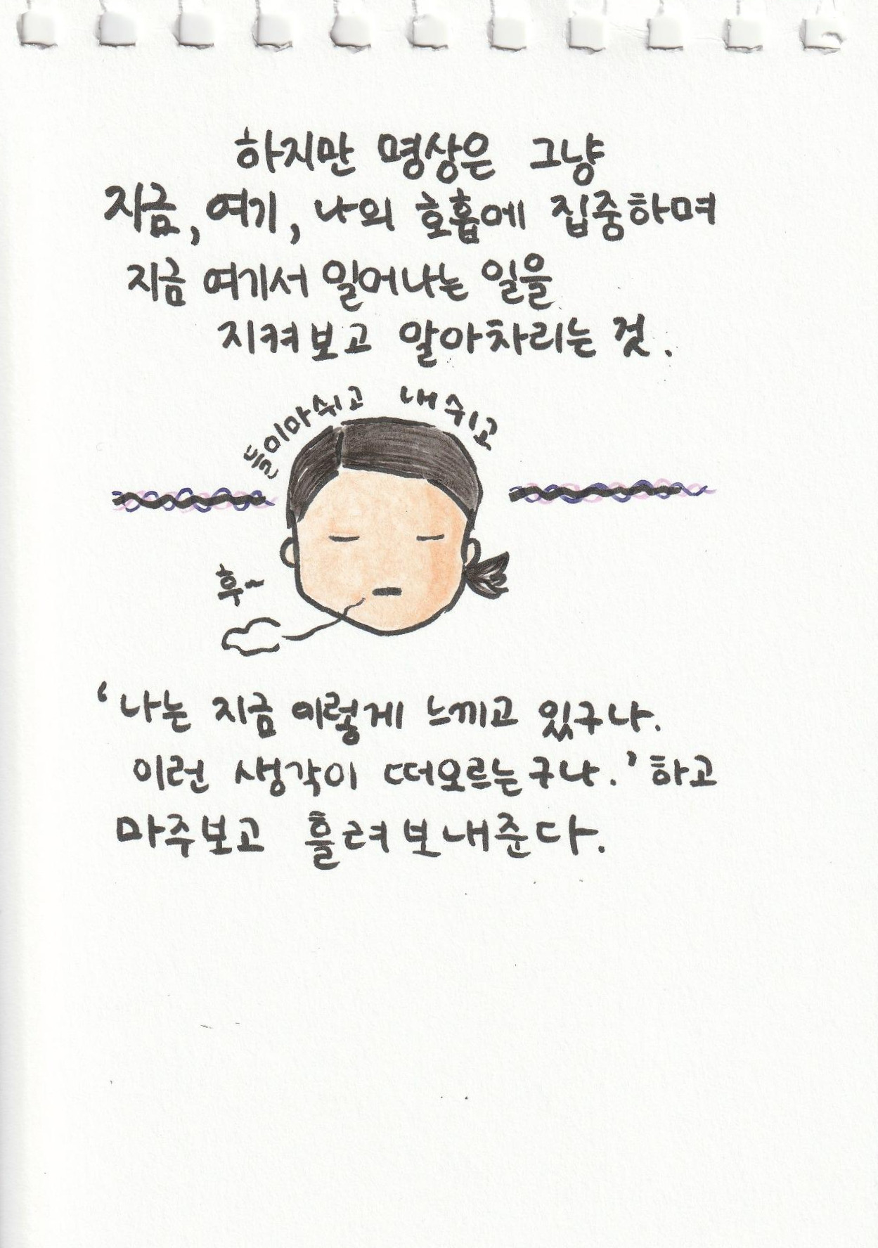 처음 명상을 시작할 때 제일 혼란스러웠던 게 바로 ‘생각 비우기’였어요. 아무리 생각을 비우려고 해도 더 많은 생각이 떠오르고 마음이 분주해졌거든요. ..하지만 명상은 생각을 없애는 게 아니라 알아차리고 충분히 느끼고 흘려보내는 것이라는 걸 알게됐어요. ..생각과 감정은 저항하면 저항할수록 더욱 더 강화됩니다. 부정하지 말고 마주해보세요. 순식간에 흘러나가버리는 감정을 느끼게 될 거에요. 모두 이너피스!