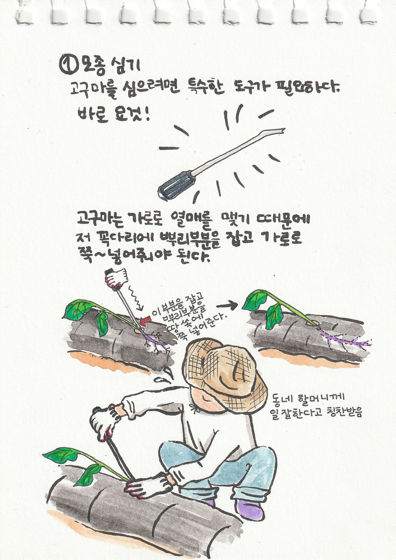 140평 밭에 고구마를 잔뜩 심게 되었어요. 농사 경험이라곤 1도 없는 초보 농사꾼들이 모여서 유튜브를 보며 우당탕탕 해냈네요. 고구마 모종을 심을 때는 특별한 도구가 필요하다는 것도 몰랐고 고구마가 가로로 열매를 맺는 다는것도 이번에 처음 알았어요.