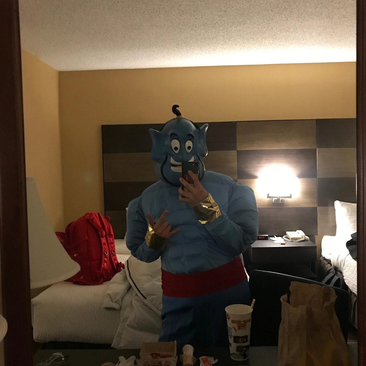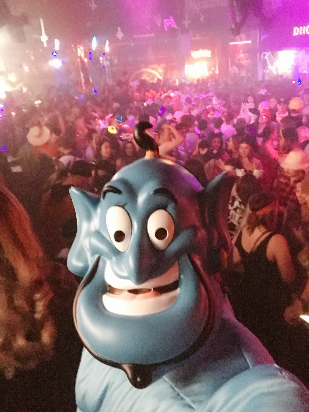 외국에서 처음 맞는 할로윈데이. 10월 31일이 할로윈 데이였기 때문에 일이 끝나자마자 렌트카를 빌려서 1시간 30분 거리에 있는 캘거리라는 도시로 향했다. 다음 날은 원래 일하는 날이었지만 호텔에 말해서 11월 1일 근무를 미리 빼놨다. 같이 일하던 한국인 누나와 함께 갔는데 그 누나는 피 묻은 간호사 코스튬을 했고 나는 당일 날 코스튬 샵에 가서 이것저것 보며 고민한 끝에 지니를 골랐다. 그때 한창 유행하던 신서유기라는TV 프로그램에서 규현이 지니 코스튬 했던 게 생각나서 얼굴을 파란색으로 칠하려고 했지만 시간이 없어서 그냥 지니 가면으로 대체했다. 얼굴까지 신서유기처럼 분장했으면 최고였을텐데. 같이 갔던 누나도, 나도 외국에서 맞는 할로윈은 처음이라 둘 다 출발할 때부터 신나 있었다.