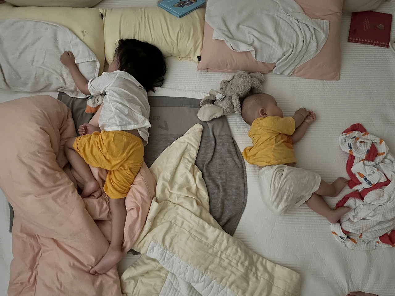 양심은 단호하다. 단호한 양심의 눈총이 따갑다. 나는 눈 딱 감고 휴대폰을 식탁 위에 탁 올려놓는다. 나만 바라보는 아이들이 놀이매트 위에서 꼼지락댄다. 가는 길에 기저귀 하나 쓱 집어서 아이들 옆에 앉는다. 둘째 기저귀 갈아주고, 첫째 유아변기통 비워주고. 신랑 나가기 전에 깎아둔 복숭아를 가져와서 첫째는 포크로 찍어 먹이고, 둘째는 숟가락으로 긁어서 먹이고. 책을 읽어달라고 가져오는 첫둥이의 부은 얼굴이 귀엽다.