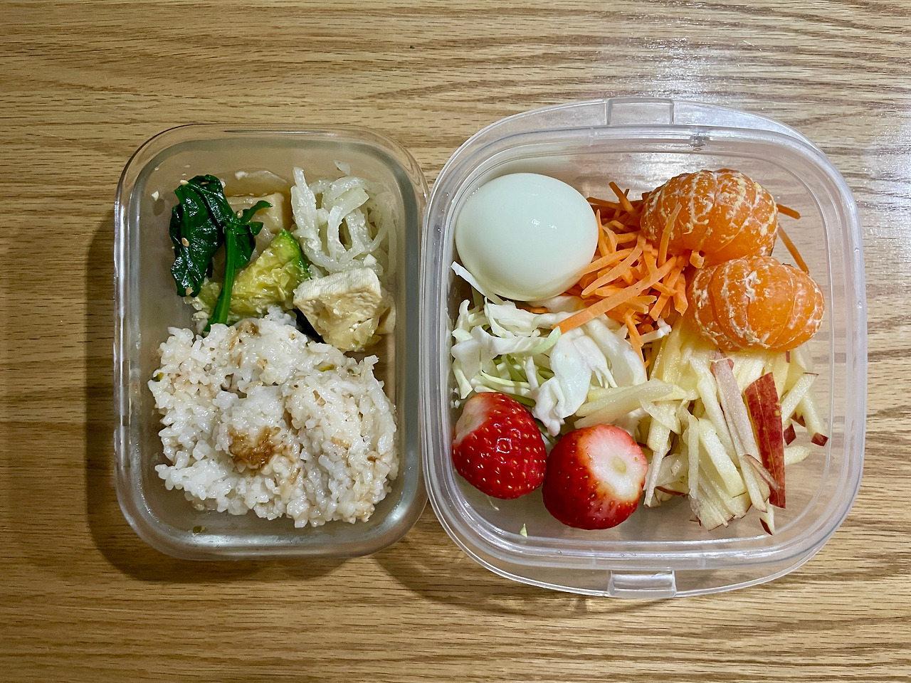 달걀 네 알이 익을 동안 사과 반쪽을 껍질째 채 썰어 신랑 도시락에 반, 내 아침 샐러드 접시에 반씩 나누어 담는다. 타이머가 있으니 나는 그 안에 작업을 끝내고 싶어 긴장을 한다. 슈웅 미끄러지듯이 냉장고로 다가가 엄마가 미리 채 썰어 주신 양배추통과 당근통을 신속하게 꺼낸다. 아삭아삭 오독오독 채 썬 양배추와 당근을 남편 도시락에 한 움큼, 나의 샐러드 접시에 한 움큼. 어제 씻어 둔 딸기 세 알, 엄청나게 다디 단 귤도 한 개 귀엽게 올린다.