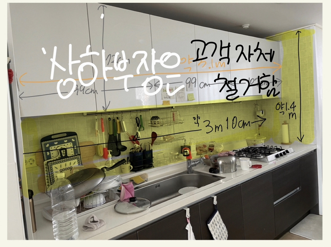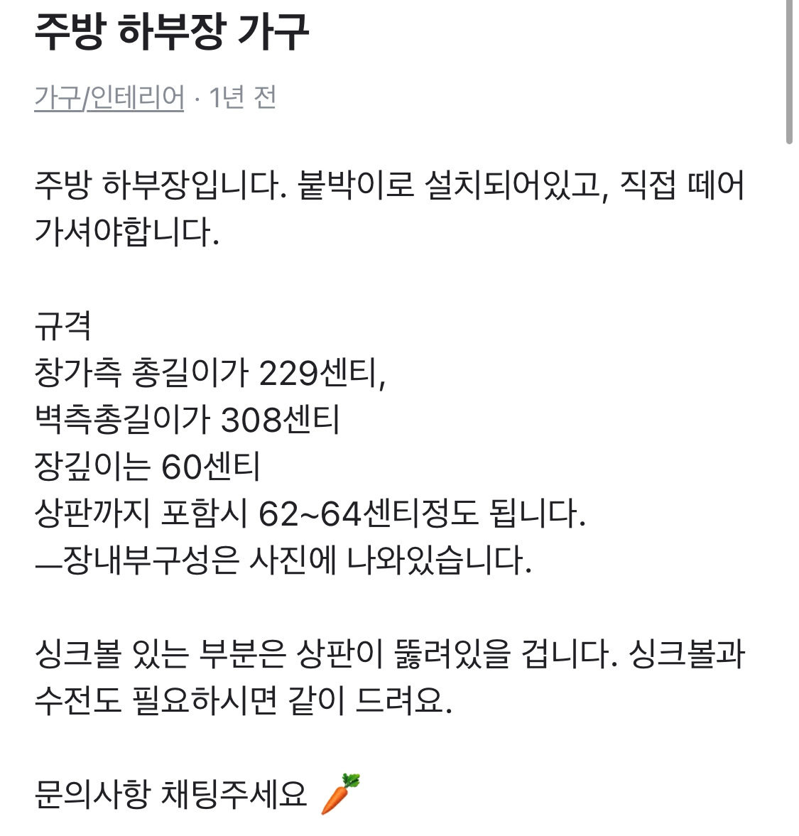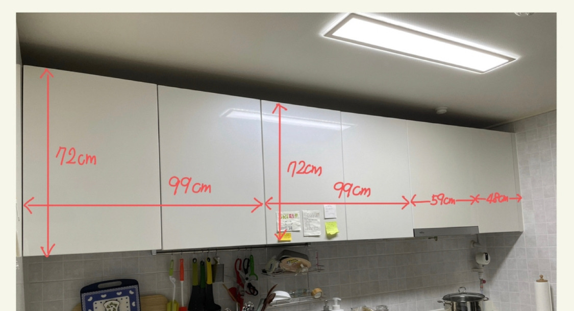 아기의 낮잠 시간, 신랑이 퇴근해서 아기를 돌봐주는 시간 동안 나는 줄자를 들고 주방을 누비며 상부장과 하부장, 냉장고 붙박이장의 넓이, 높이, 깊이를 꼼꼼하게 측정하여 당근 마켓에 나눔 글을 올렸다. 규격을 자세히 적어 올리는 것이 중요하다.