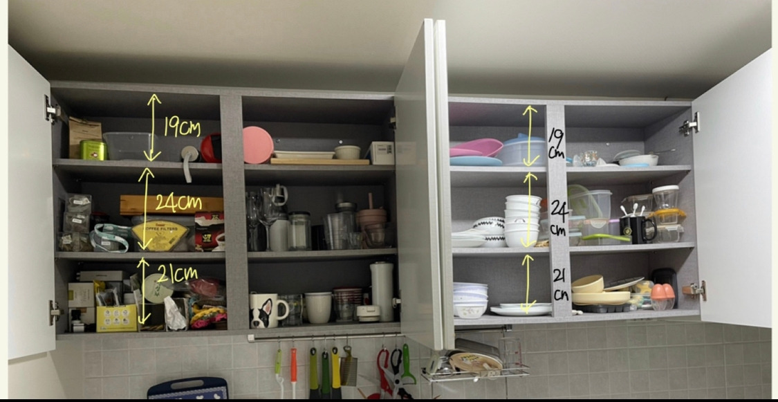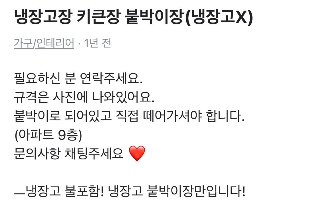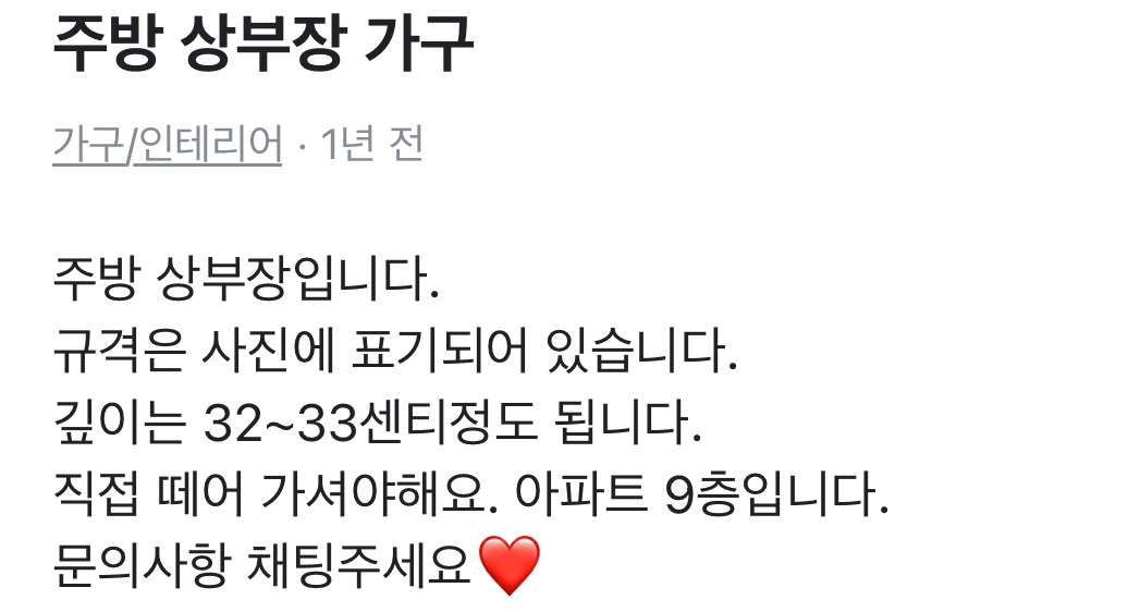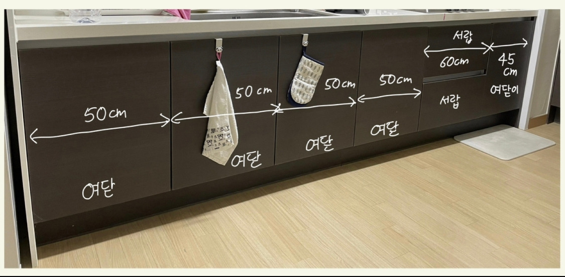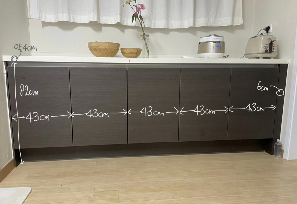 아기의 낮잠 시간, 신랑이 퇴근해서 아기를 돌봐주는 시간 동안 나는 줄자를 들고 주방을 누비며 상부장과 하부장, 냉장고 붙박이장의 넓이, 높이, 깊이를 꼼꼼하게 측정하여 당근 마켓에 나눔 글을 올렸다. 규격을 자세히 적어 올리는 것이 중요하다.