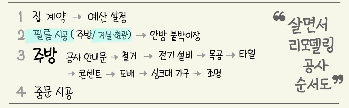 화사해진 공간을 여유롭게 누리고 싶었지만 안타깝게도 나는 참 바빴다. 작업 후 집안 곳곳에 남은 먼지들을 꼼꼼히 치우느라고 말이다. 당장 아기가 기어 다닐 곳이니까. 먼지를 없앤 후에도 쉴 틈은 없었다. 아기를 데리고, 주방 철거 이후 임시 숙소로 쓸 방을 찾으러 다녀야 했다. 철거일 D-3. 아직도 숙소를 정하지 않았다.
