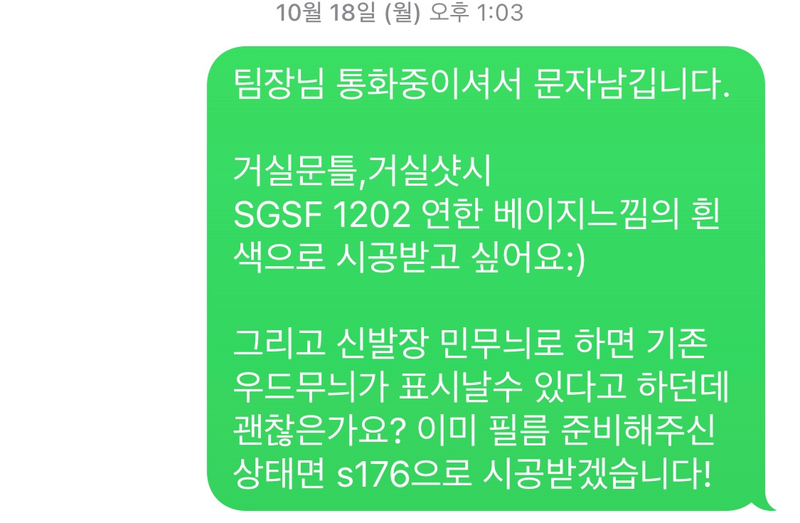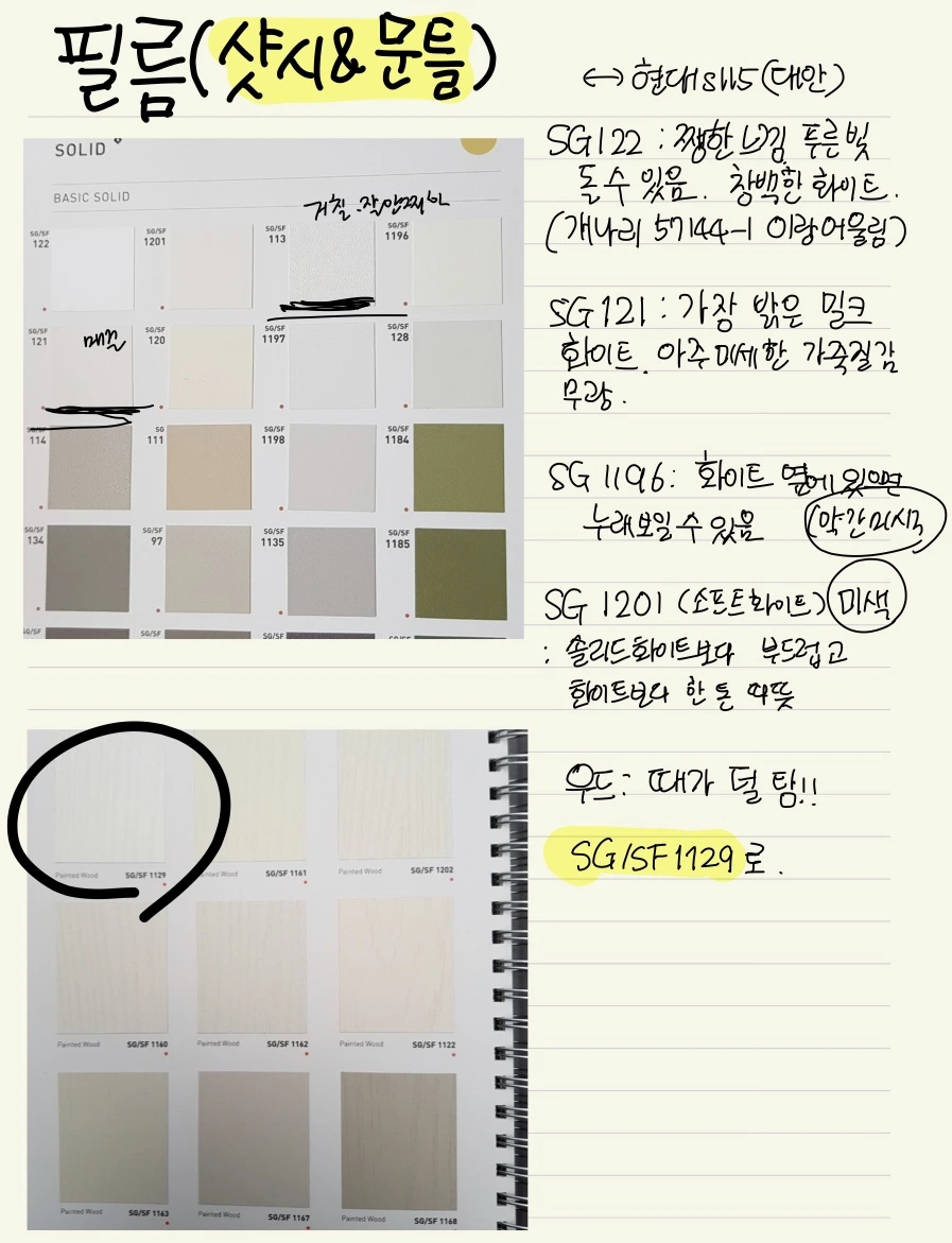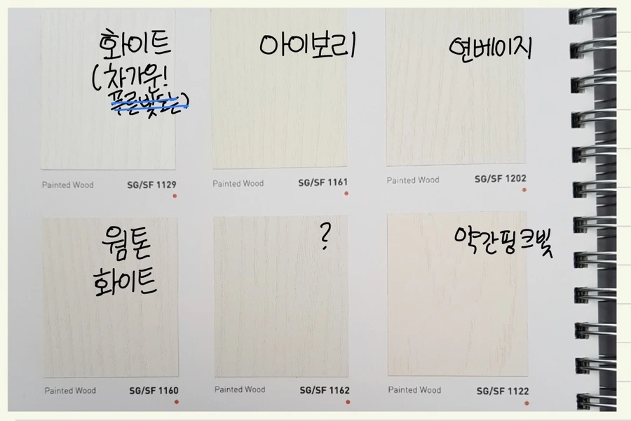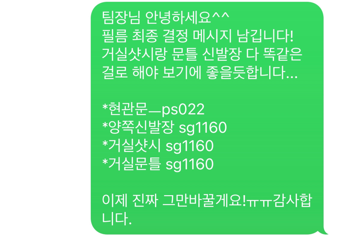 나는 선택이 어려워서 이랬다가 저랬다가 했다. 시공일을 이틀 남겨두고 현관문은 영림 ps022(딥 그린 중에서도 당시 후기들 중 내 눈에 가장 영롱해 보였던 색깔), 현관 신발장과 거실 새시, 베란다 문틀은 sg1160(가까이서 보면 나뭇결 무늬가 보이는 약간 따뜻한 느낌의 하얀색)으로 결정했다. 충분히 고민했기에 후회가 없다.