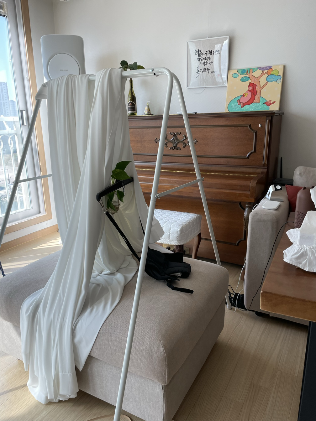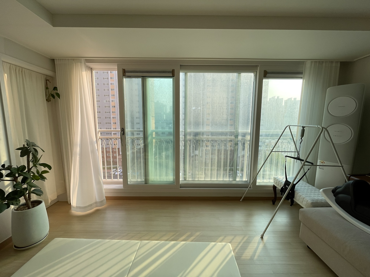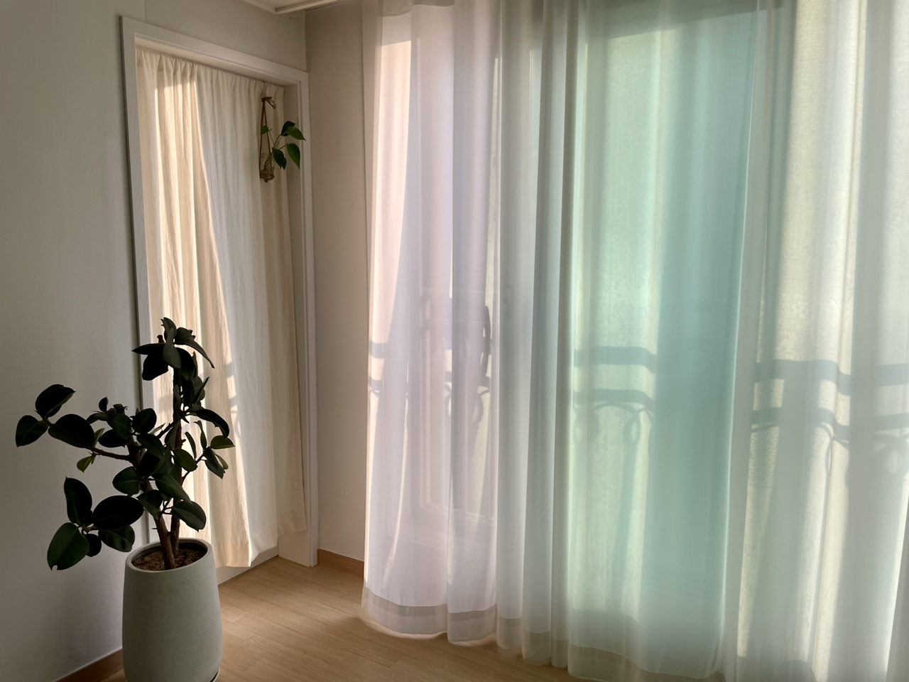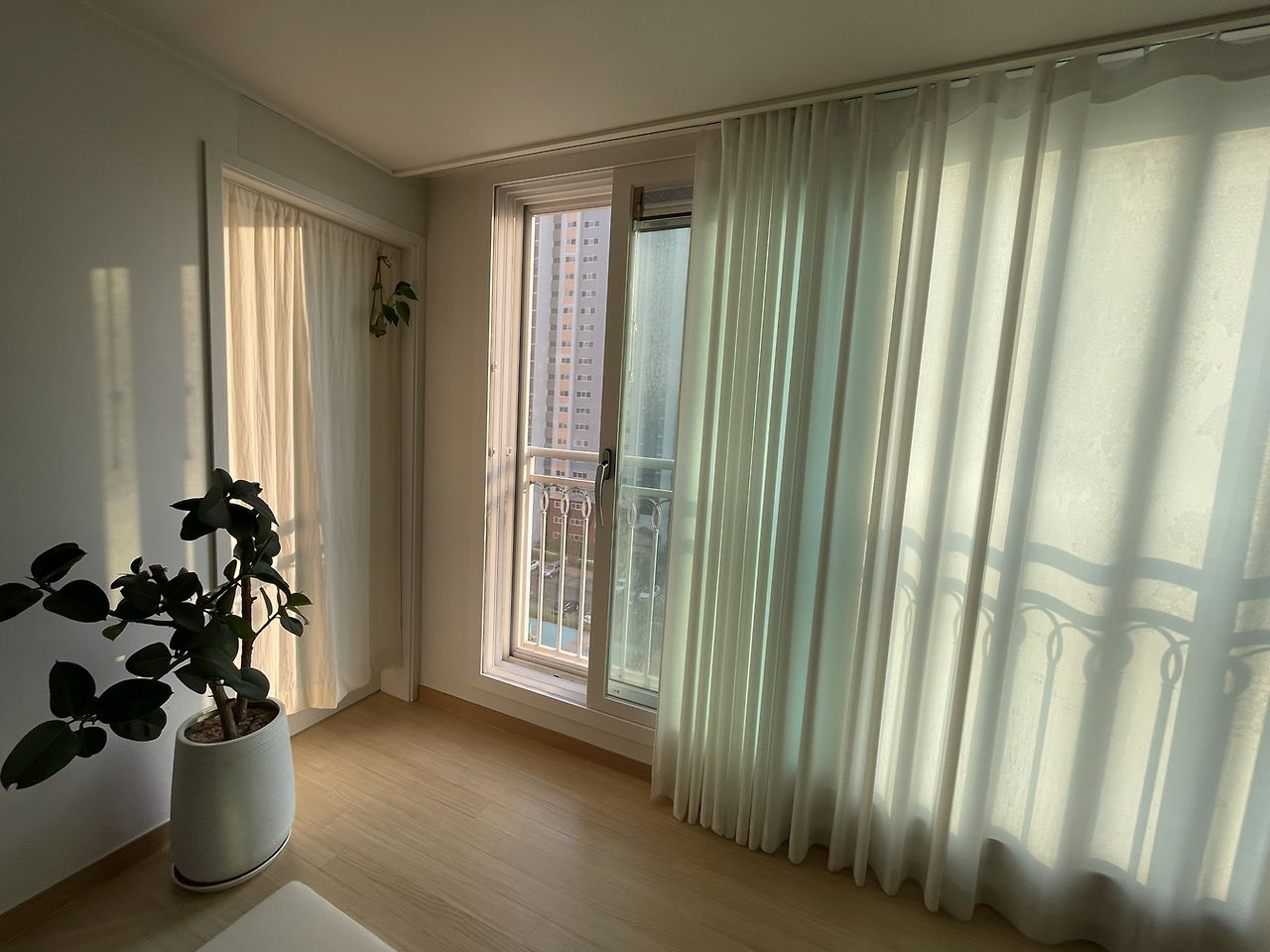 거실 새시와 다용도실 문틀 변신 후 모습. 따뜻한 하얀빛 테두리가 같은 톤의 커튼과 이질감 없이 어울려서 좋다.