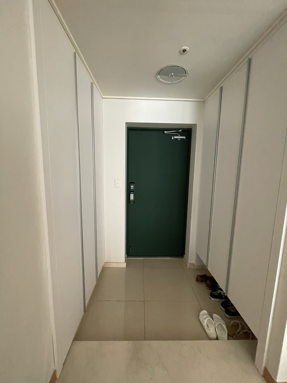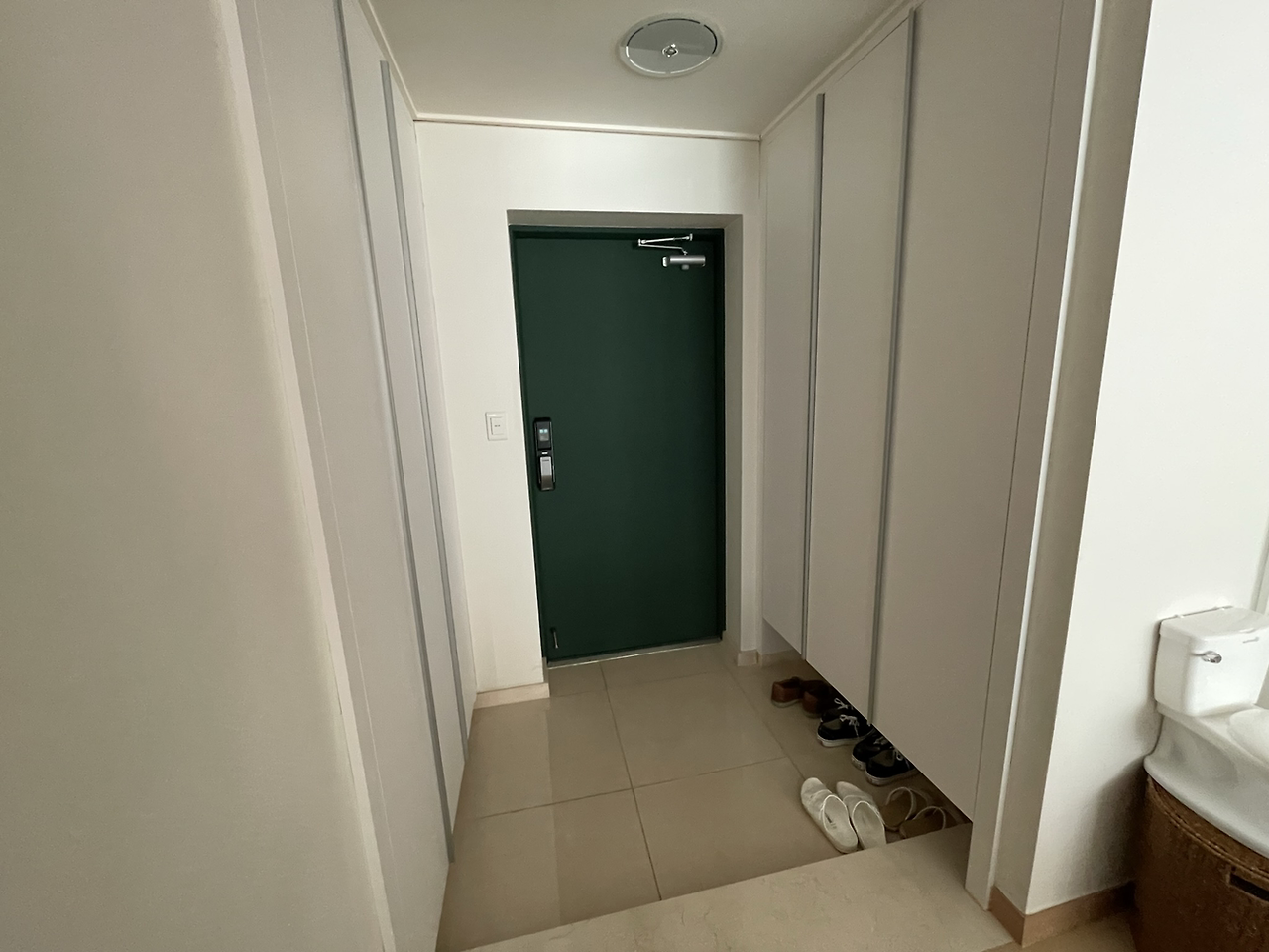 따뜻한 흰색과 스타벅스 느낌의 딥 그린색을 입은 현관 모습이다.