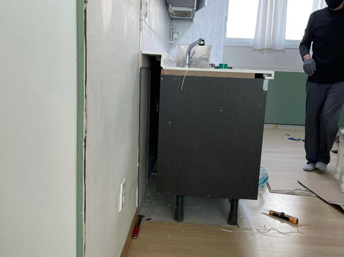 작업이 시작된 지 2~3시간 남짓 지난 11시경. 12개월 딸에게 젖을 먹이면서 ‘모두들 점심을 먹어야 할 텐데’ 생각하며 배달의 민족 어플을 켰다. 냉장고 붙박이 장과 상부 장이 얼추 철거된 상태였다. 나는 속이 후련하기도 하고, 이제 진짜 되돌릴 수 없구나 긴장되기도 하고, 이왕 뜯기 시작한 거 빨리 끝났으면 좋겠다 싶기도 했다.