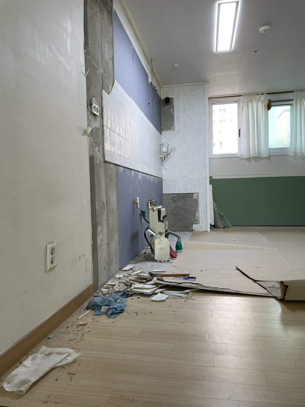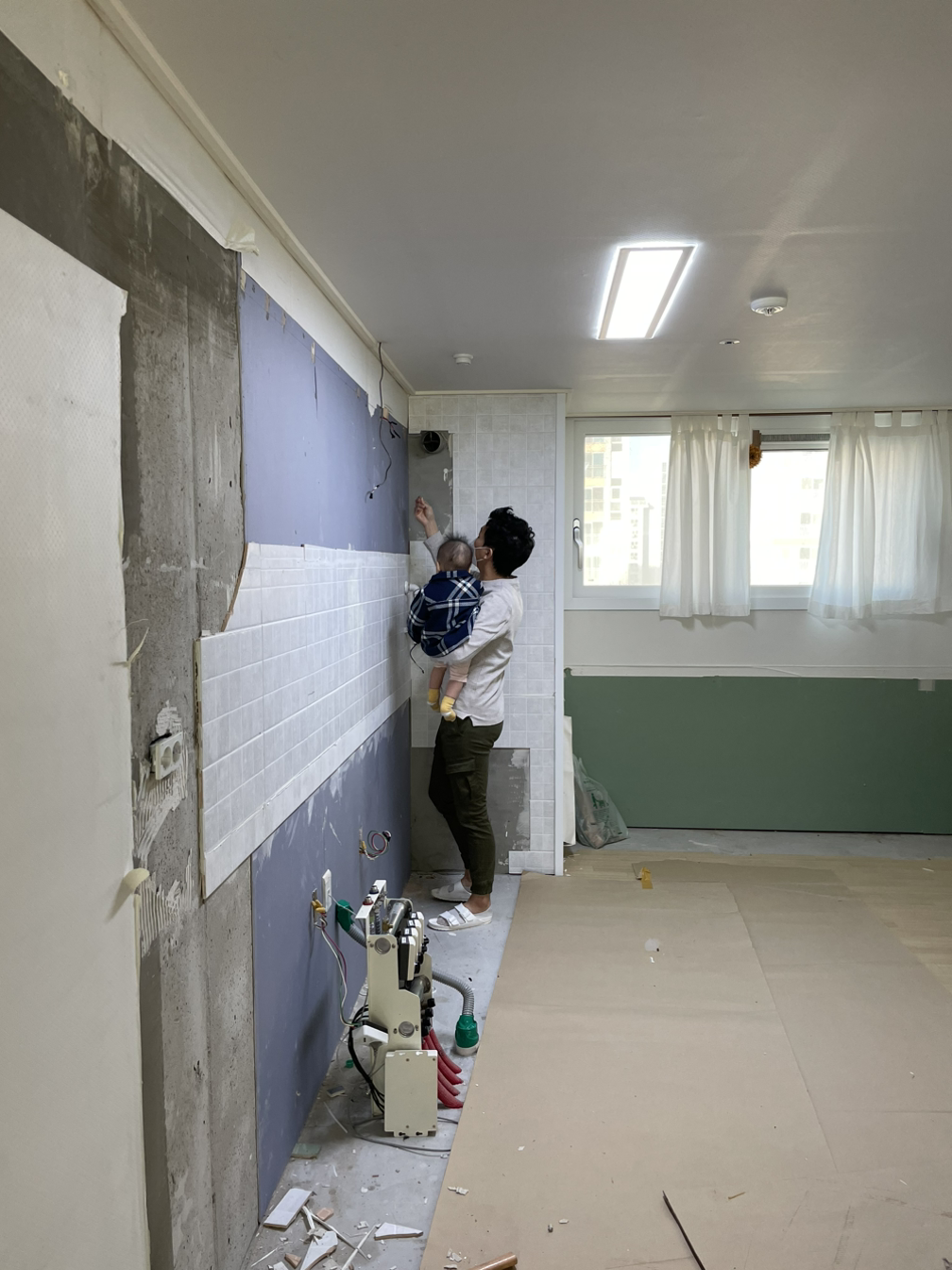 신랑은 철거가 진행 중인 주방과 안방을 오갔다. 철거한 장을 옮길 때 힘을 보태기도 하고, 아기와 놀아주기도 했다. 우리 부부는 부모이자 집주인이자 철거 작업자이자 인테리어 업자였다.