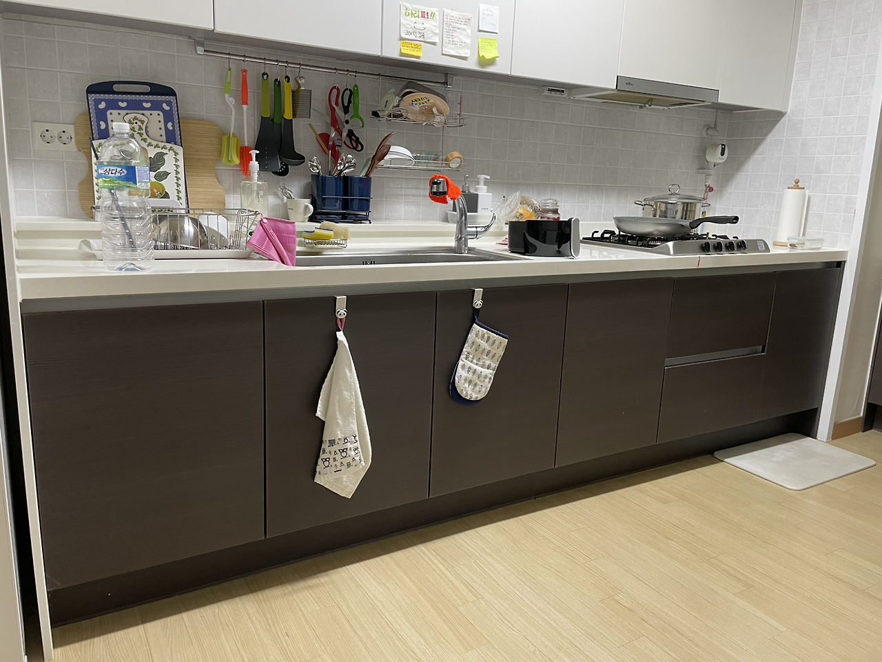 주방 상부 장, 하부 장 철거 당일. 오전 8시 반에서 9시 사이에 도착하겠다고 한 당근 유저님은 8시 20분이 조금 지난 시각에 칼 같이 도착했다. 현관에 타일 깔기와 같은 일을 함께 셀프로 했다는 남편분, 전기 기술자이신 남동생 분과 함께였다.