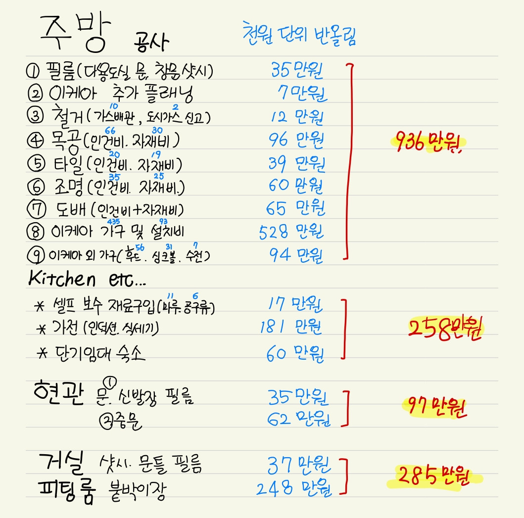 공사 후 지출 내역을 정리해보니 총 1576만 원을 썼다. 아낄 수 있는 것은 최대한 아끼며 진행한 결과이다. 목표 예산에 얼마간 보탠 금액으로 최대 예산을 정한 것은 심리적, 현실적 측면 모두에서 약간의 숨통을 틔워주는 역할을 했다.