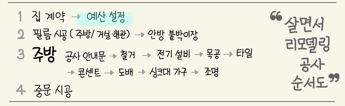 턴키 업체와 계약을 하든 반셀프나 셀프로 진행하든, 집 전체를 대대적으로 리모델링한다면 위 1~21번의 순서를 거의 빠짐 없이 거치게 된다. 하지만 상황에 따라 순서가 빠지거나 바뀌기도 한다. 자신의 집의 리모델링의 범위가 어떻게 되는지를 각자의 꼼꼼히 확인해야 한다.