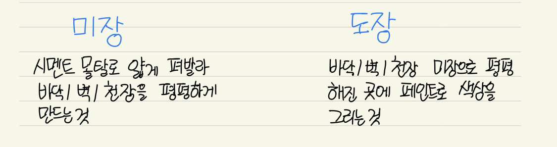 눈동냥 손동냥으로 어깨너머 공부를 하다보니 다른 용어들은 그럭저럭 이해가 되는데 6번 미장과 16번 도장은 차이가 무엇인지 파악하기 어려웠다. 미장은, 집 전체를 철거하는 경우 울퉁불퉁해진 벽과 바닥, 천장에 시멘트를 펴발라서 평평하게 만들어주는 것이다. 도장은, 평평해진 벽면에 페인트칠을 하는 것이다. (우리 집은 주방과 거실만 도배를 다시 하였고, 별도의 미장, 도장 작업을 하지 않았다.)