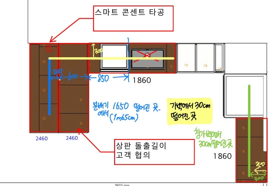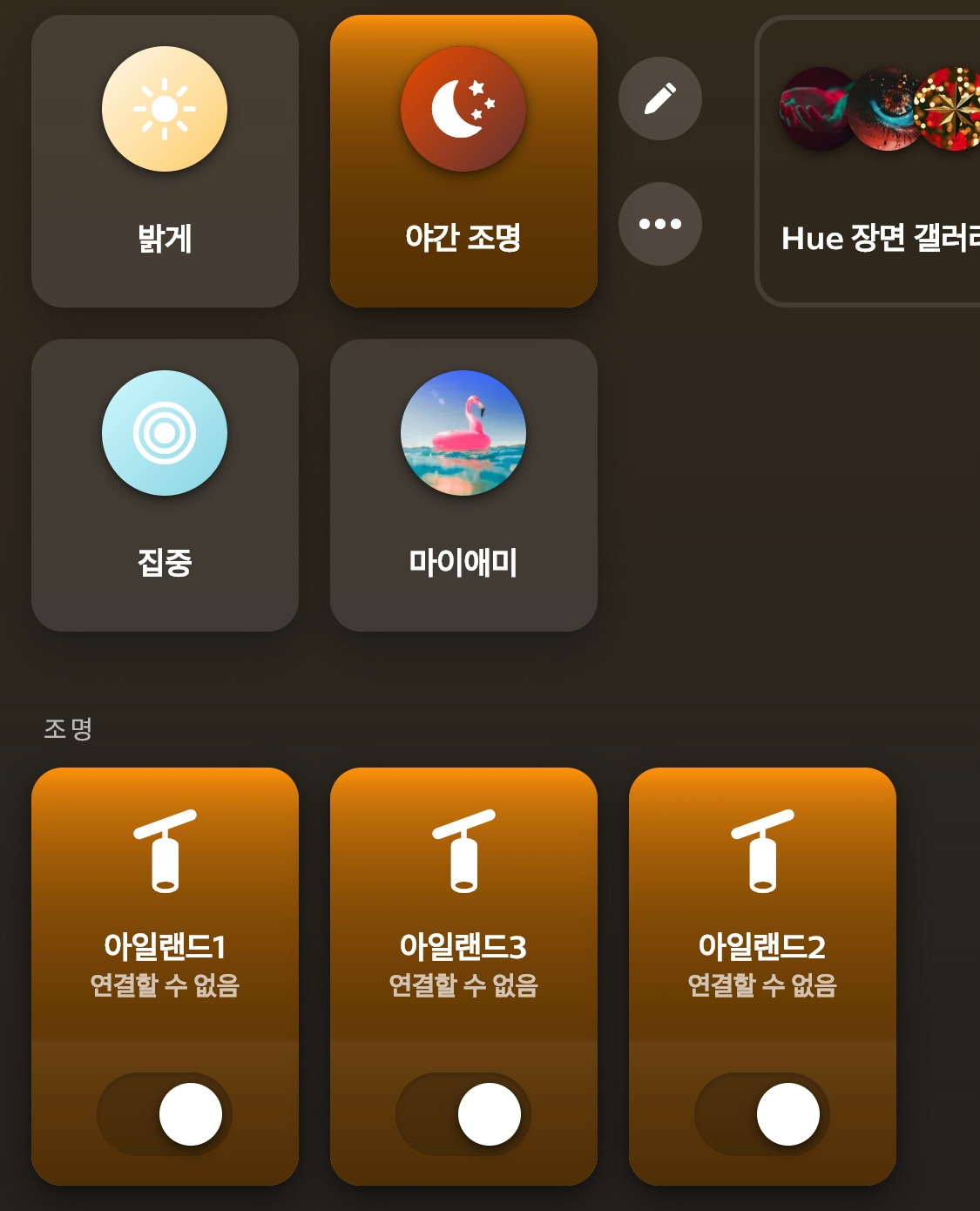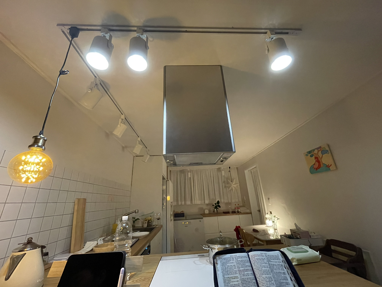 야심 차게 준비한 부분은 아일랜드 식탁 위쪽(파란색 라인)에 설치한 스마트 조명이다. 스마트 전구 3개가 들어있는 필립스 휴 4.0 스타터 키트를 사서 끼워 넣었다. 밥 먹을 때는 전구색, 공부하거나 책 읽을 때는 형광 등색, 야식 먹을 때는 어두운 조명, 분위기를 내고 싶을 때는 알록달록한 색감을 설정하여 다채로운 느낌의 주방을 즐긴다. 2021년 11월 기준 12만 7천 원에 사서 끼워 넣은 스마트 전구 3개는 1년이 다 되어가는 지금도 아주 멀쩡하게 잘 작동하고 있다. 보통 전구 하나에 몇천 원 하는 데 비해 필립스 휴 4.0 스마트 전구는 하나에 3~4만 원으로 몸값이 비싼 편이었으나, 비싼 값을 톡톡히 한다는 게 우리 부부의 결론이다.