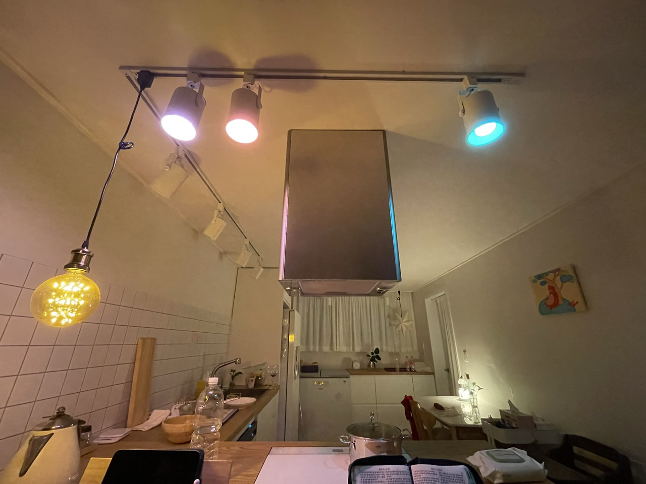 주방 조명은 보통 싱크대 위쪽으로는 주백(흰색, 형광등색) 또는 주광(아이보리) 색, 식탁 위쪽으로는 전구색(노란빛)을 설치한다. 설거지할 때는 밝고 깨끗한 느낌, 밥을 먹을 때는 음식이 맛있어 보이는 따뜻한 느낌의 조명 색을 택하는 것이다. 주백, 주광, 전구색 세 가지 중에서 어떤 색 조명을 어디에 배치하면 좋을까 고민하던 나에게 신랑이 ‘스마트 조명’을 제안했다. 스마트 조명?