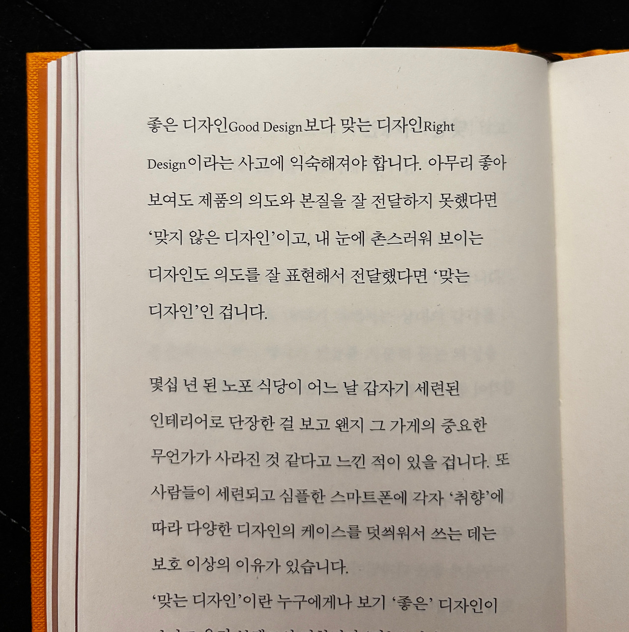 [틀린 디자인]이 아니라 [옳은 디자인]을 해냈다면 그때부터 [좋은 디자인]과 [나쁜 디자인]을 따져야 한다. 나쁜 디자인을 해도 좋다고 생각한다. 좋고 나쁜 디자인은 사람에 따라 그 평가가 달라질 수도 있고 상황이나 때에 따라 바뀔 수 있다. 결국엔 내가 얼마나 많은 경험과 노력으로 성장하는지에 따라서 [좋은 디자인]을 할 수 있는 역량이 더 커지는 것이다.