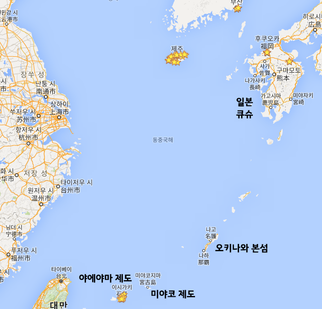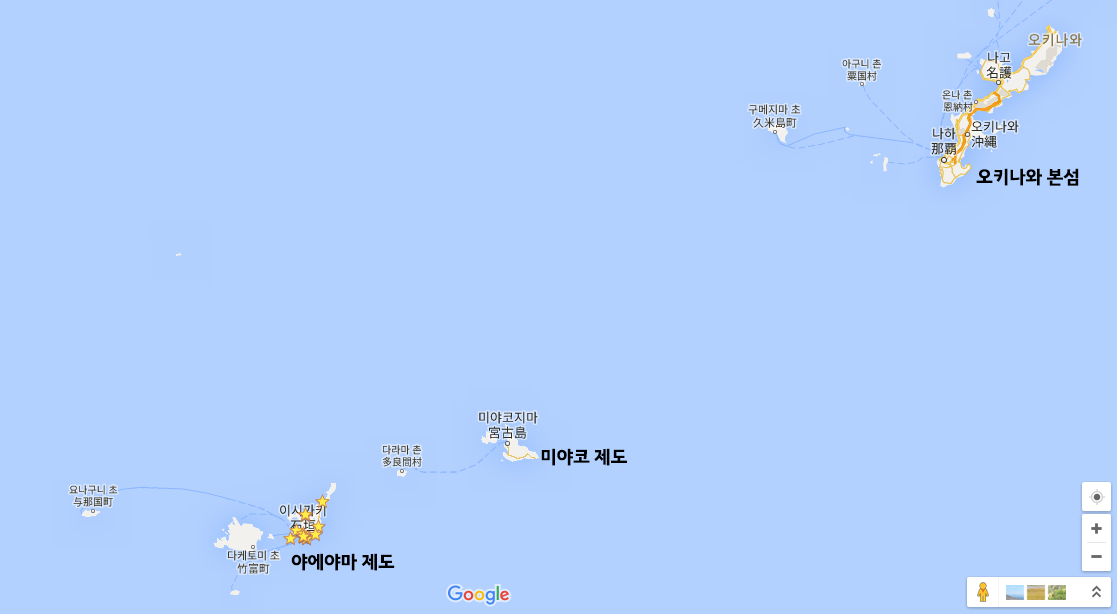 이시가키섬은 일본 본섬에서도 왼쪽 아래로 많이 내려가야 나타난다.