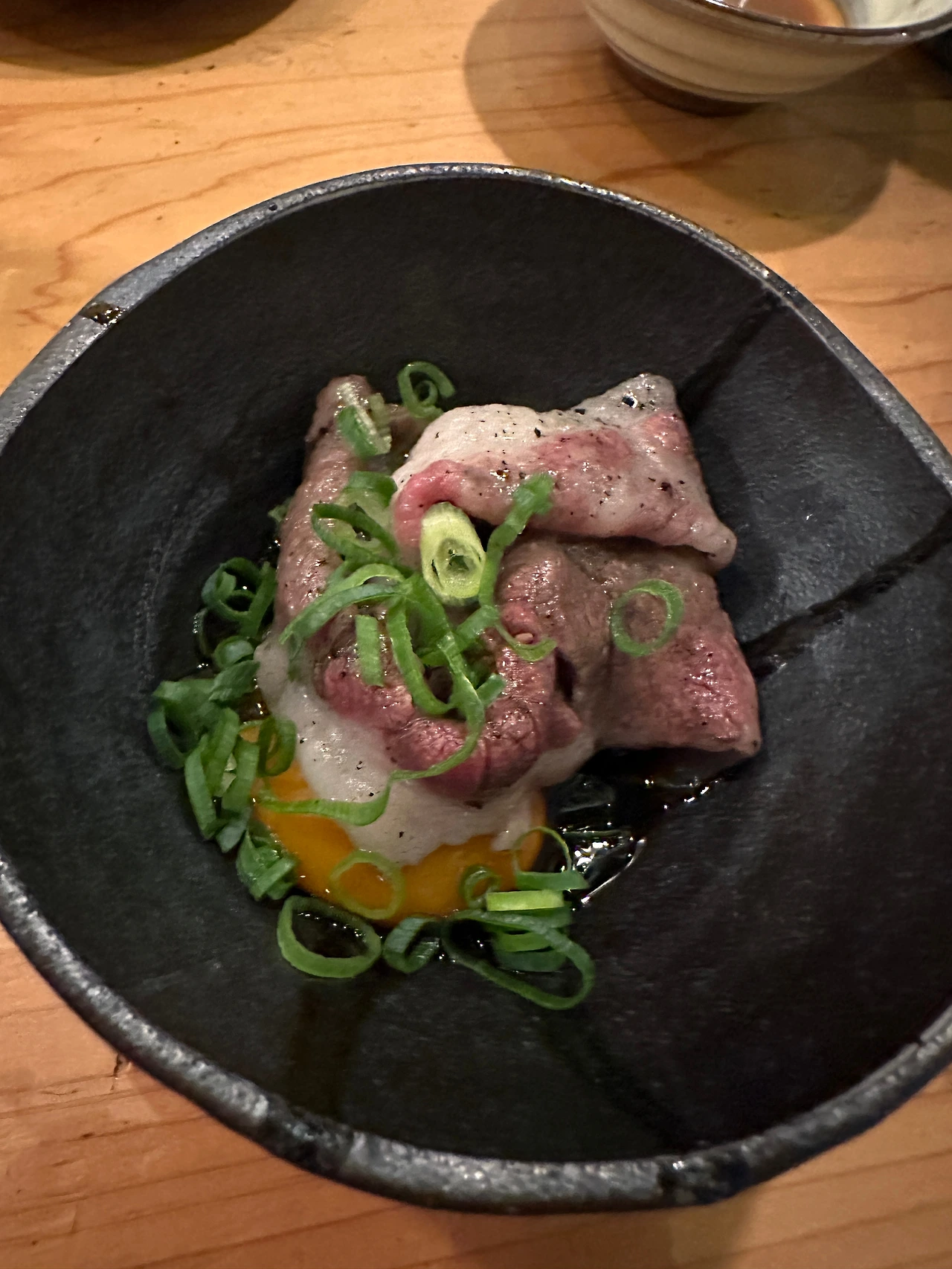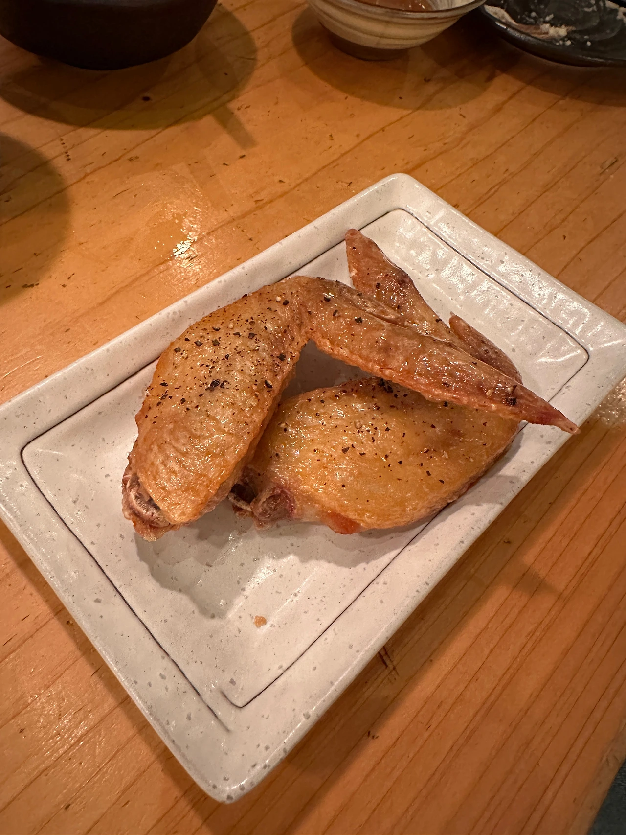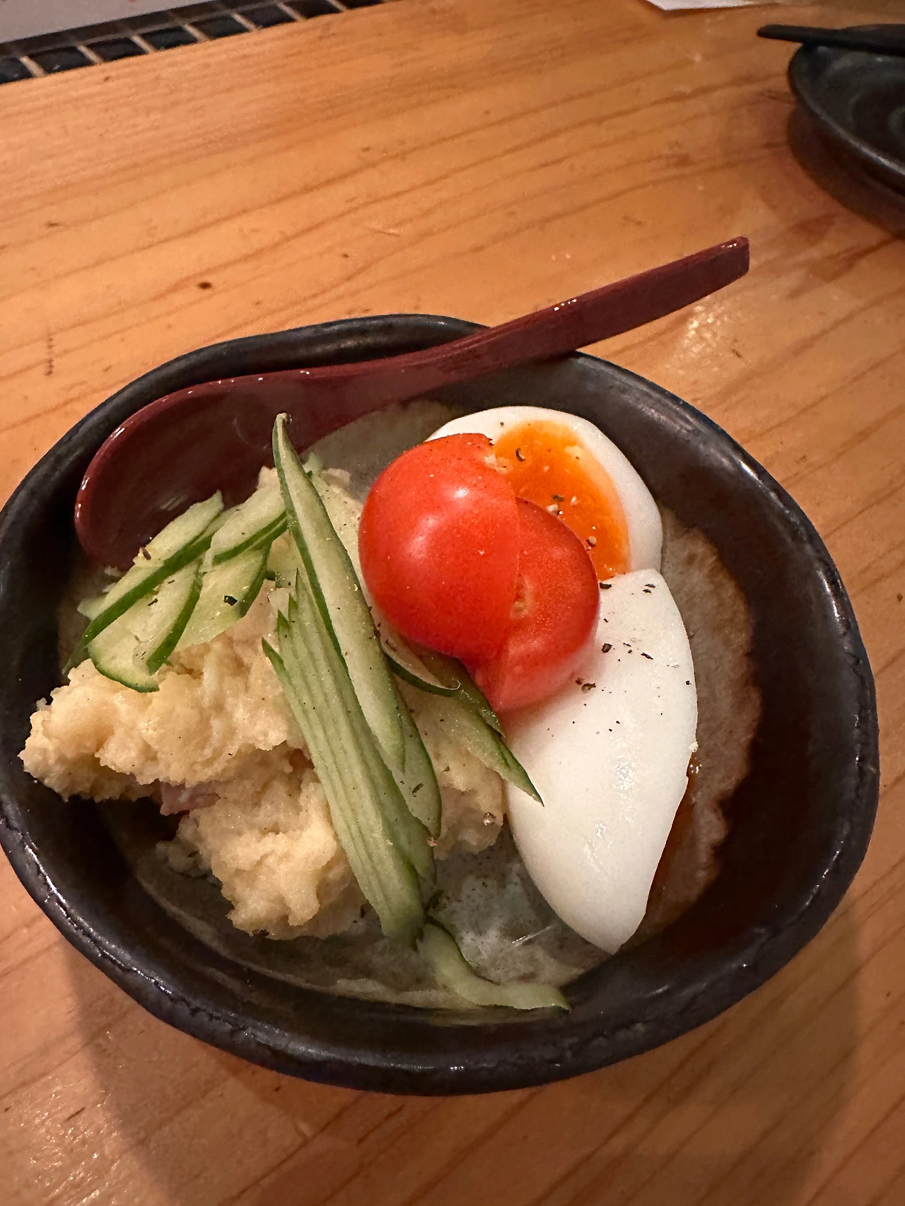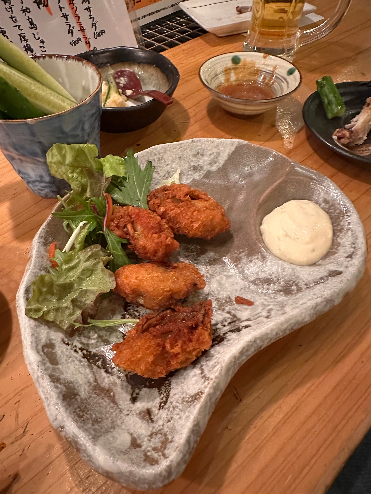 파파고의 도움으로 이것저것 시켜봤는데..!! 어떻게 이렇게 또 다 맛있는 건가요.. ㅠㅠ 감자샐러드랑 닭날개튀김이랑 굴튀김에 스끼야끼까지... 다 최고! 인당 330엔 이상 주문하면 생오이를 서비스로 주는데 이 소스가 또 기가 막혔다. 땅콩소스랑 간장을 섞은 그런 걸로 추정되는데 느끼함도 잡아주고 딱 좋았다. 사장님이 한국어도 조금 하신다. 추천!