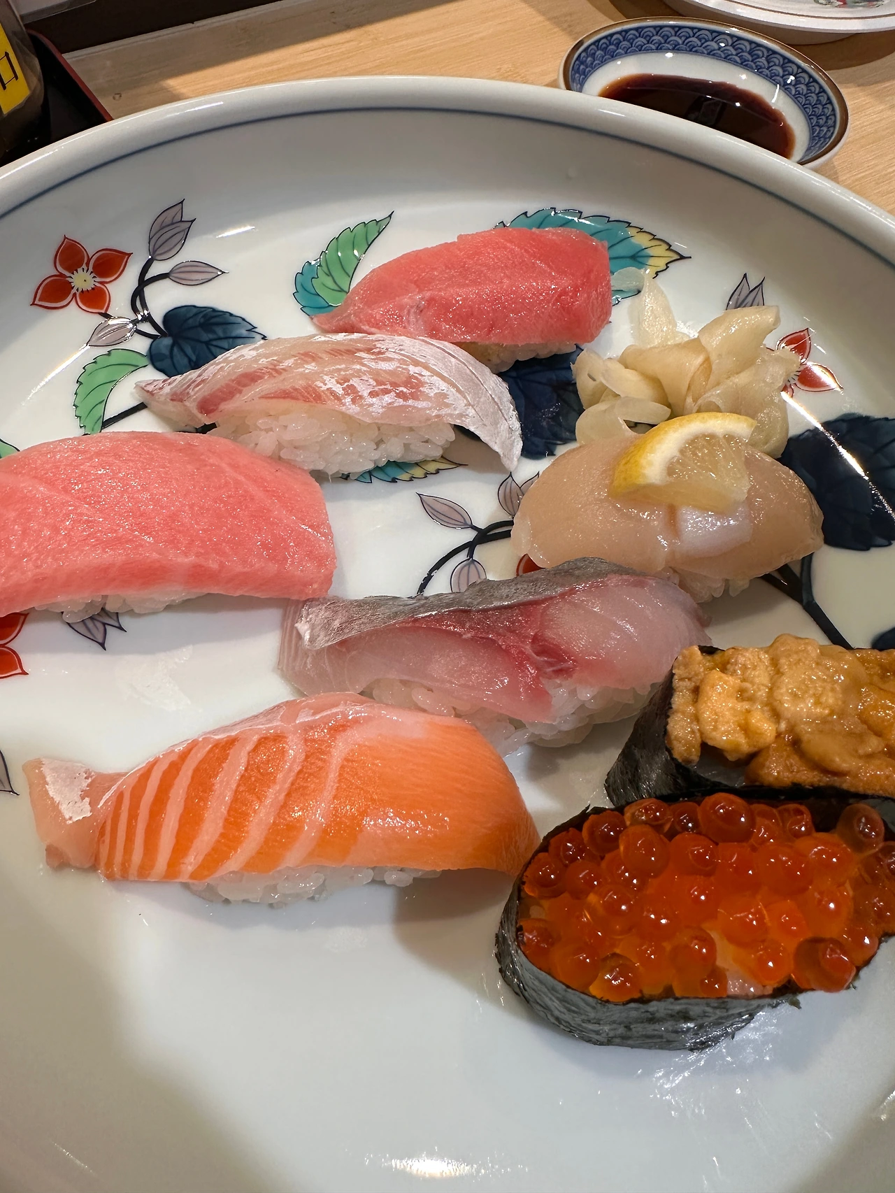 하카타역 지하상가에 있는 우오가시 초밥집! 기본 세트에 참치세트에 짝꿍이 좋아하는 계란 초밥도 시켰다. 회전 초밥집 같이 생겼지만 회전하는 건 메뉴를 써놓은 종이 판들 뿐.. 무난한 가격의 무난한 가게인데 맛은 꽤 괜찮다. 생선을 써는 자세와 칼질도 아주 프로페셔널하다. 우린 애매한 시간을 잘 노려 줄 서지 않고 먹었는데 평소엔 대기도 있다고 한다.