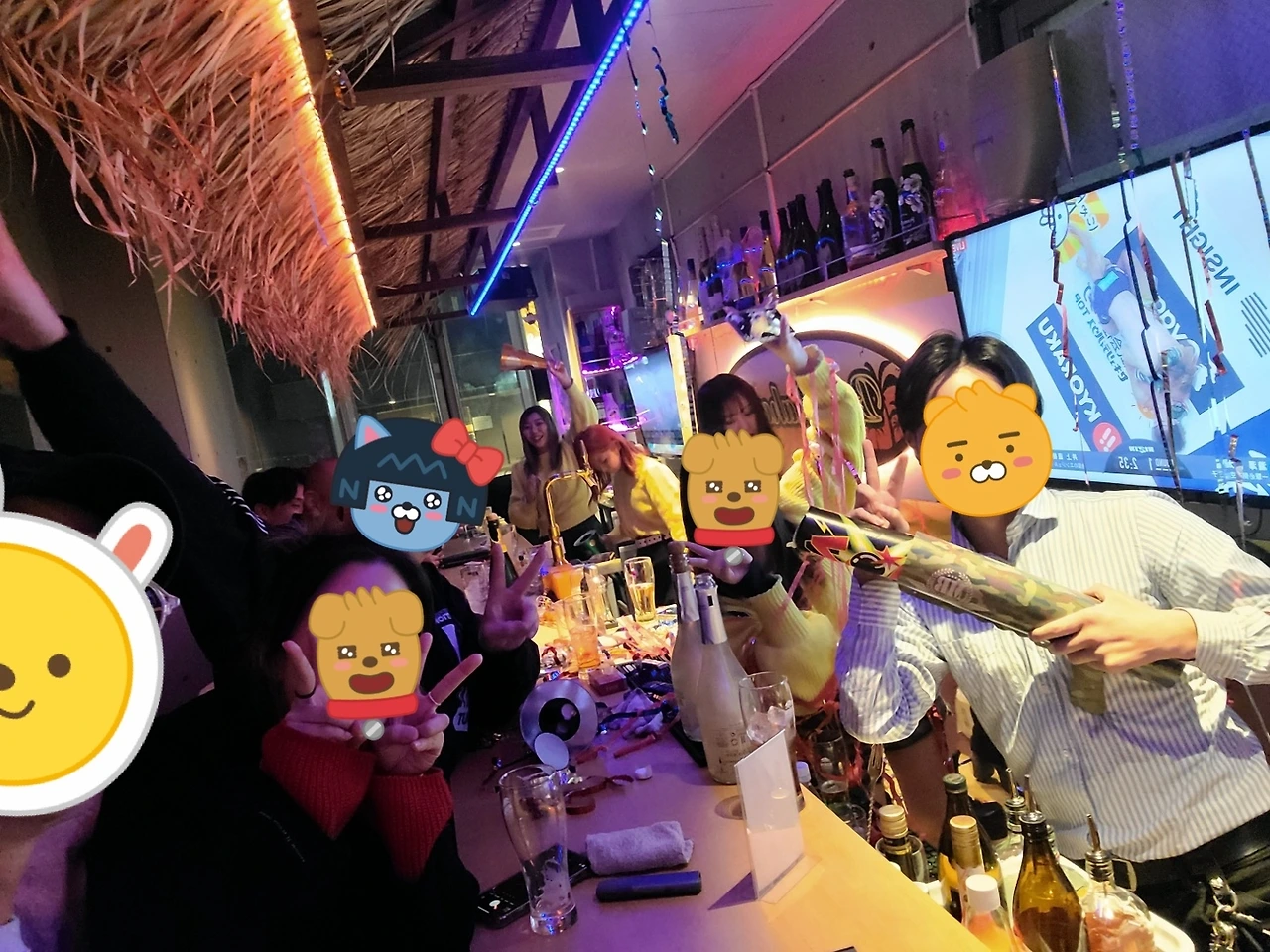 어젯밤 핫했던 클럽 앞엔 여전히 사람이 많았지만 문 을 닫은 술집도 많았다. 그래도 좀 사람들이랑 이야기할 수 있는 데에 가고 싶어서 헤매다가 사람들한테 요이오토시요 외치다가 어떤 친구들이 같이 인사해서 어디 가냐고 해서 따라감 원래는 3,500엔에 무제한 형식인데 한잔만 마실순 없냐고 물어보니 자릿세 천 엔만 받겠다구 했다! 오키! 아무래도 마지막 날이다 보니 다들 들떠있었고 옆자리 혼자온 분도 같이 이야기하고 놀다가 샴페인 몇 병을 그분이 다 쏘셨다 아이고 ㅋㅋㅋ 우리도 마시라고 선물로 주고..!