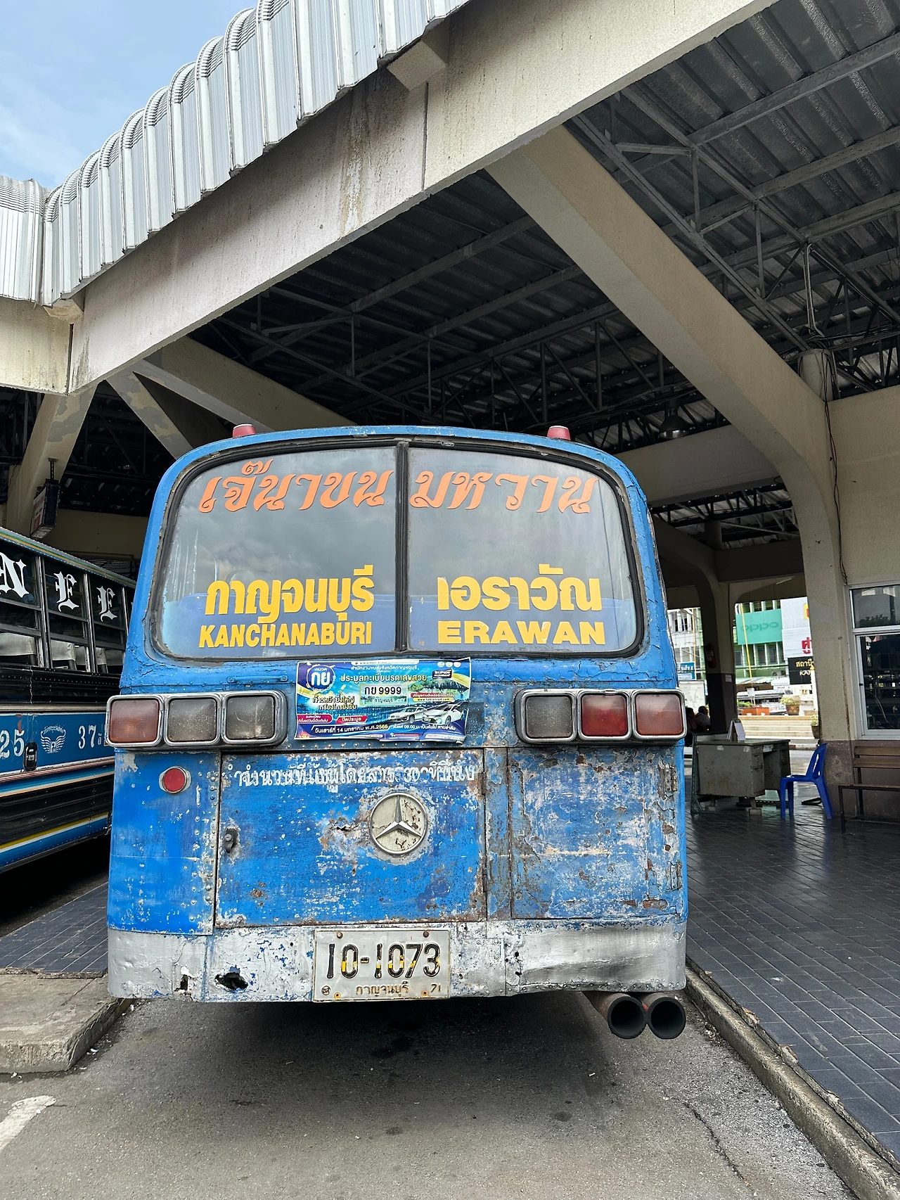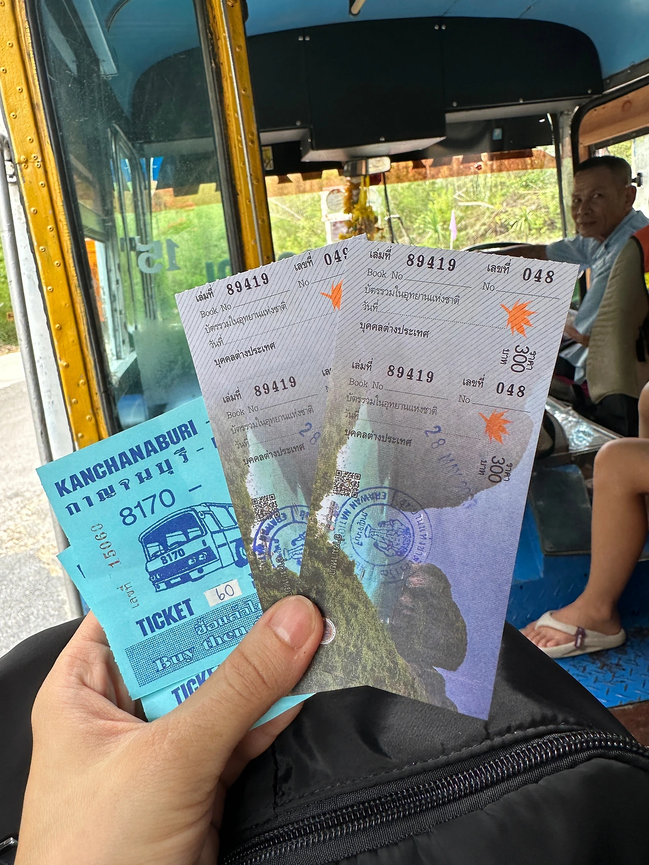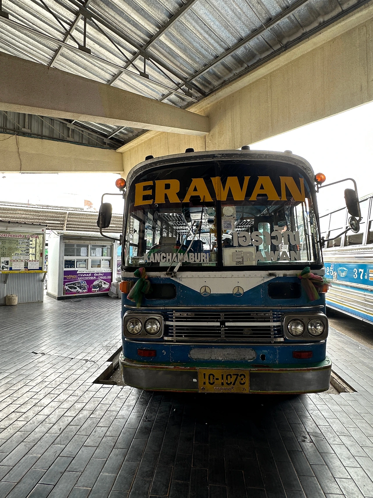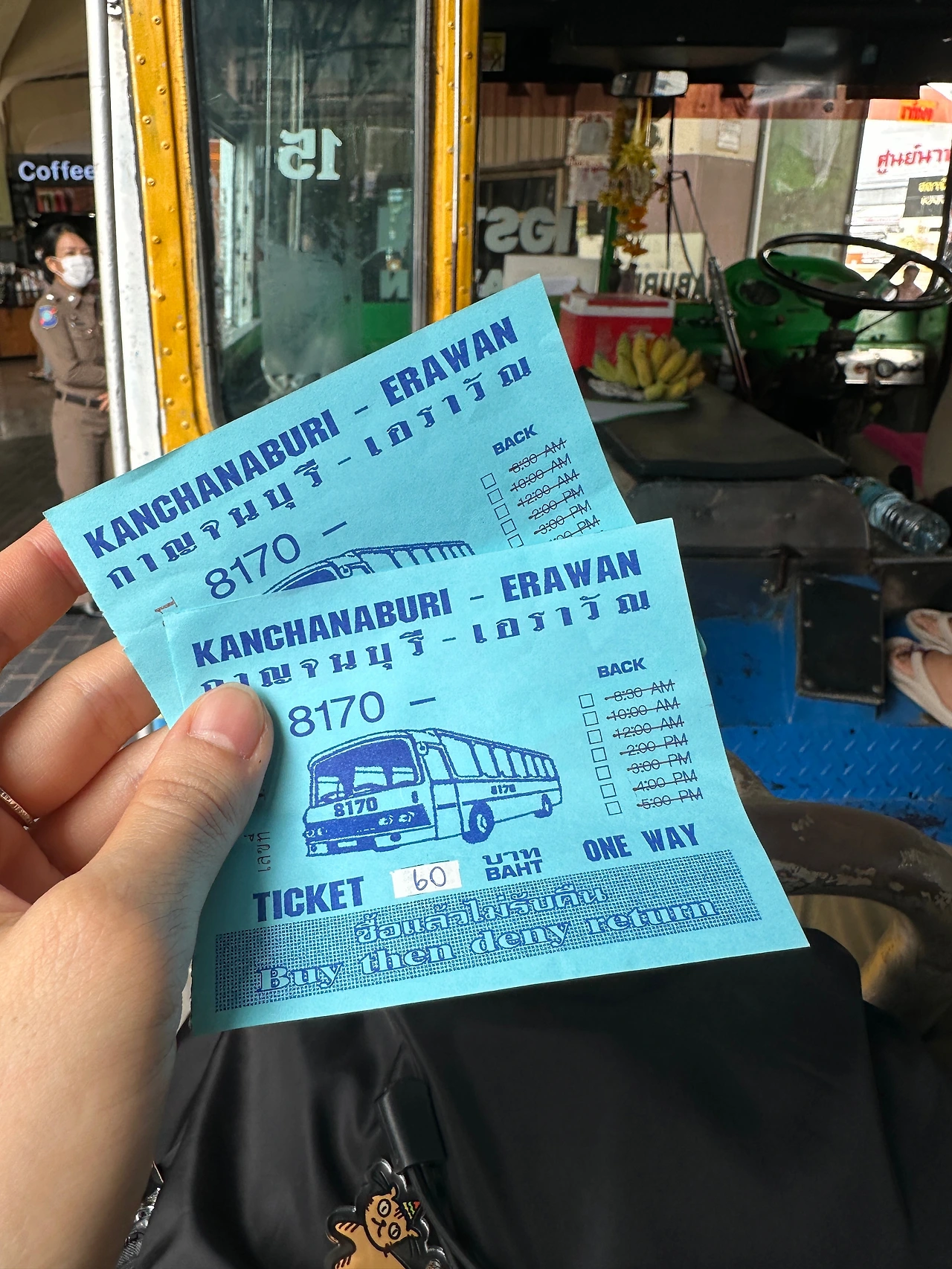 안쪽으로 들어가면 에라완이라고 쓰인 낡았지만 예쁜 버스가 있고 티켓 파는 아주머니가 앞에서 돈을 받는다. 버스비 60밧! 일단 타고 출발 후에 티켓을 사도 되는듯.