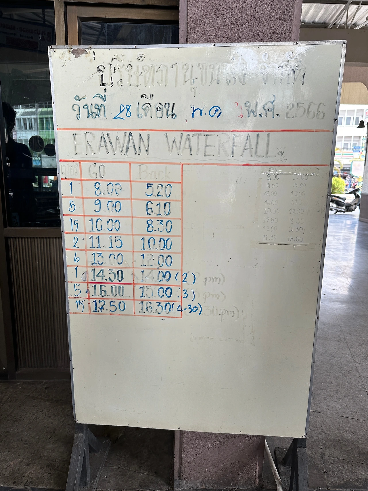 버스는 왼쪽이 칸차나부리 터미널 출발 시간, 오른쪽이 에라완 폭포 출발 시간인데 오후 2,3,4시 라고 써있었지만 막상 갔더니 3시껀 없어졌다고 했다.후후. 참고하시길.. 우린 돌아와서 방콕으로 갈거라 결국 그랩을 잡아타고 왔는데 네명 버스비랑 터미널에서 숙소까지 툭툭비 등 합치면 대략 퉁칠수 있는 정도였음. (500밧)