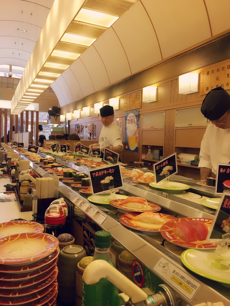 요기도 그 다들 많이 가는 도톤보리 거리를 걷다 보면 거대한 초밥 모형이 달린 그 집. 모든 초밥 130엔?!으로 가격이 저렴해서 가성비 굳. 고퀄 초밥을 원하면 다른 곳으로 가얄듯