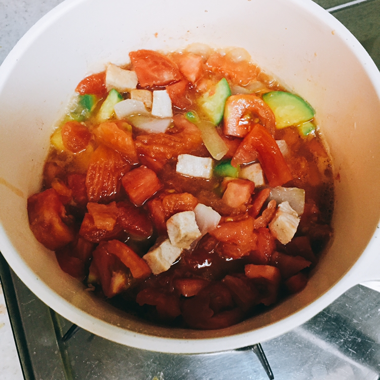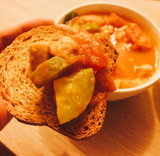 #닭가슴살, 양파, 호박을 숭덩숭덩 잘라서 올리브오일 조금 뿌려 볶아준다음 살짝 데쳐 껍질 벗겨놓은 토마토 숭덩숭덩 잘라서 넣어서 보글보글 끓이면 토마토 스튜 완성! 간을 많이 안해도 토마토라 맛있당 (미주라토스트에 올려먹으니 더 맛있당)