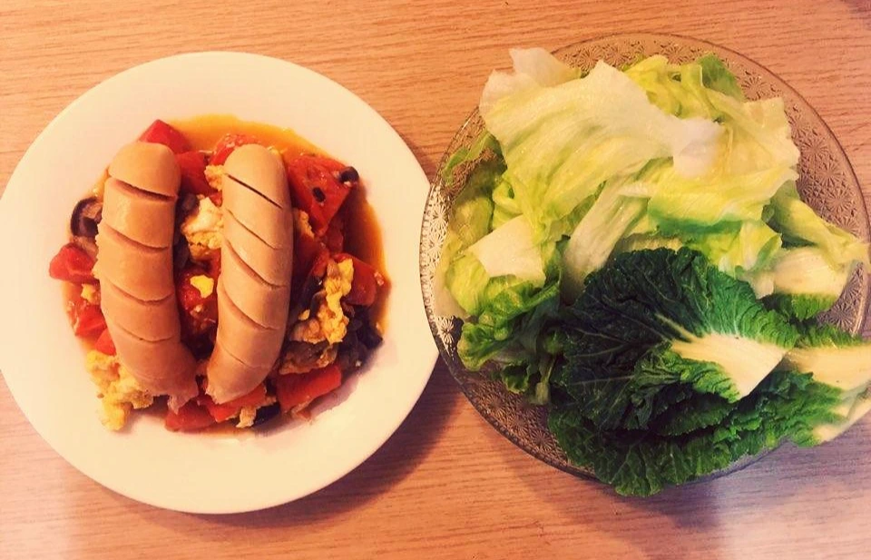 저녁- 토마토+계란+버섯볶음 & 닭가슴살 소시지 & 야채