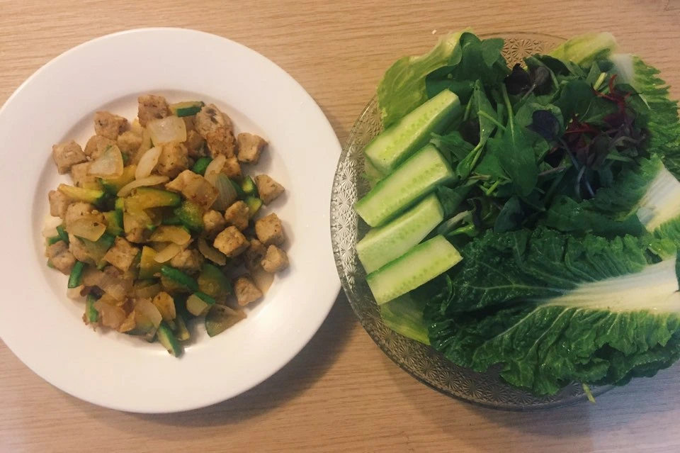 저녁- 닭가슴살 큐브+ 양파 반개+호박 볶음 & 야채